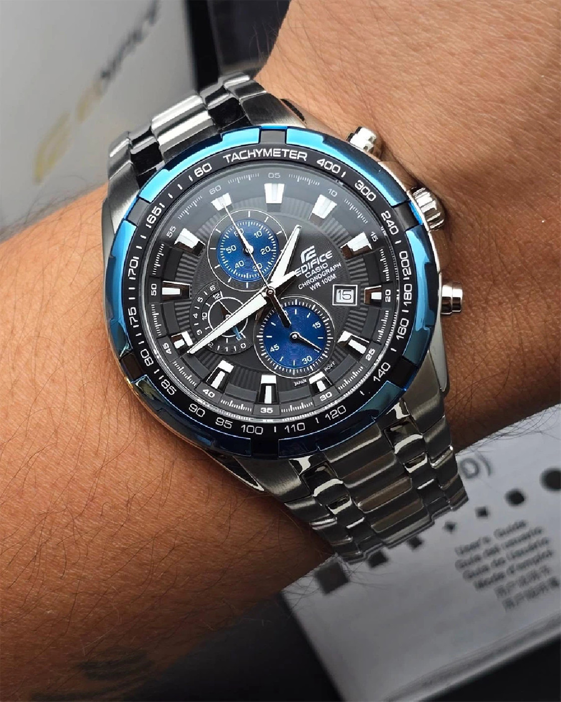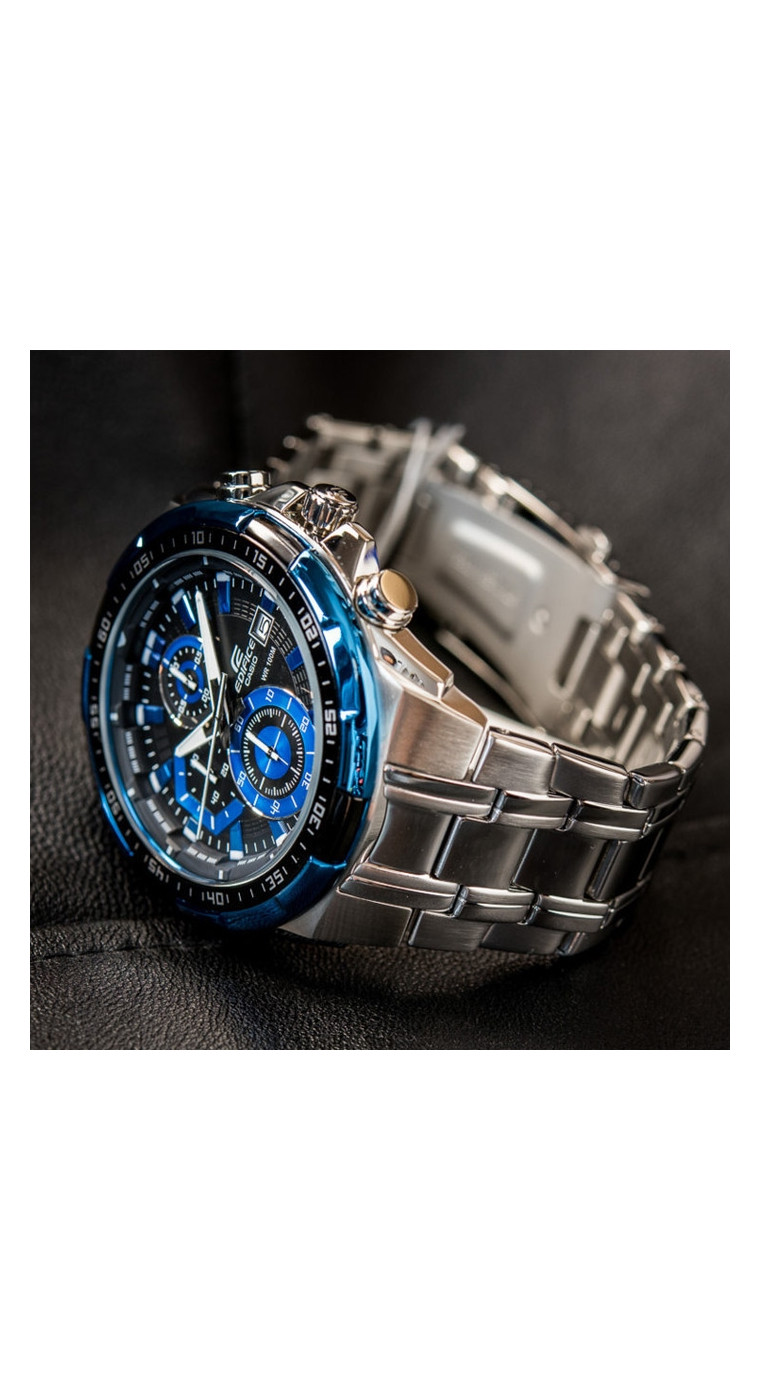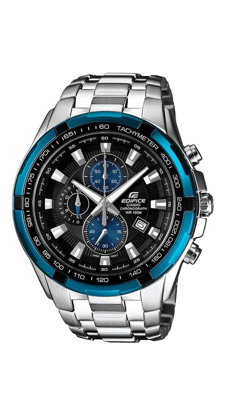 Перед вами харизматичная и узнаваемая модель Edifice со спортивным характером из серии EF-539 в стальном корпусе с большим аналоговым циферблатом черного цвета, ионизированным синим безелем и стальным браслетом! Помимо яркого современного дизайна на циферблате часов вы найдете три функциональных окошка отвечающих за секундомер, а также отдельное отображение текущей даты. Как и все эдифайсы часы водонепроницаемы, а циферблат защищен закаленным минеральным стеклом.