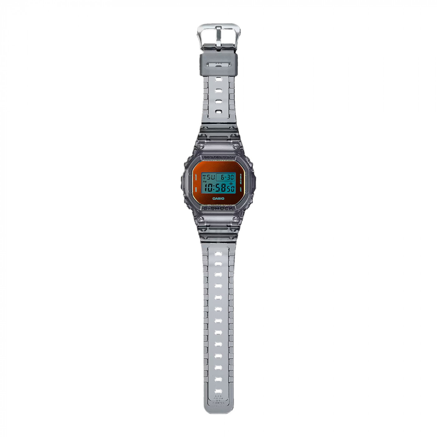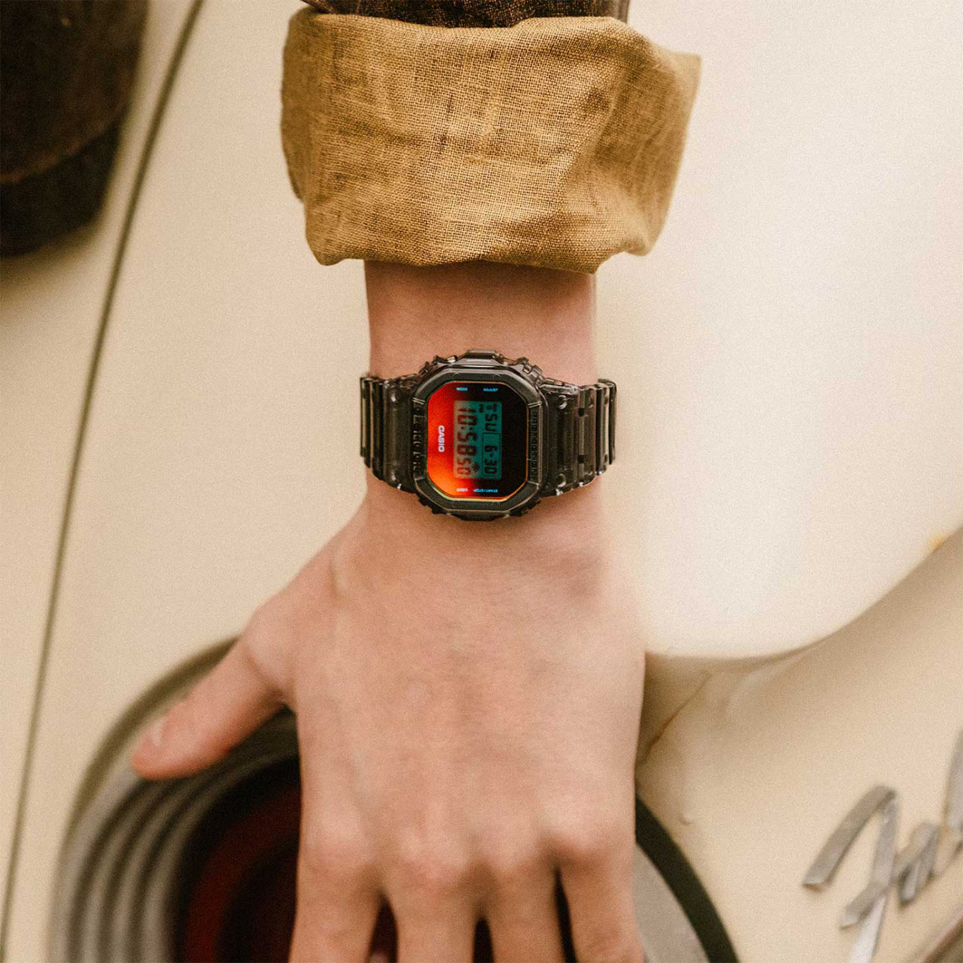 Супер редкие лимитированные джишоки 2024 года в в полупрозрачном темном корпусе из серии G-SHOCK DW-5600 c ярким эффектным циферблатом. Этим эффектом дизайнеры Casio делают отсылку к летнему закату на пляже, к предзакатному летнему небу, которое часто меняет свой оттенок и играет красками. Этот уникальный "живой" эффект циферблата удалось добиться с помощью специальной технологии вакуумного лазерного напыления, которое было нанесено не на циферблат, как это кажется на фото, а на само стекло часов. Благодаря такой технике, в зависимости от освещения и угла зрения часы постоянно играют оттенками и градиентами, приковывая к себе взгляды окружающих. Один из тех случаев, когда в реальности модель выглядит гораздо вкуснее, чем на фото.