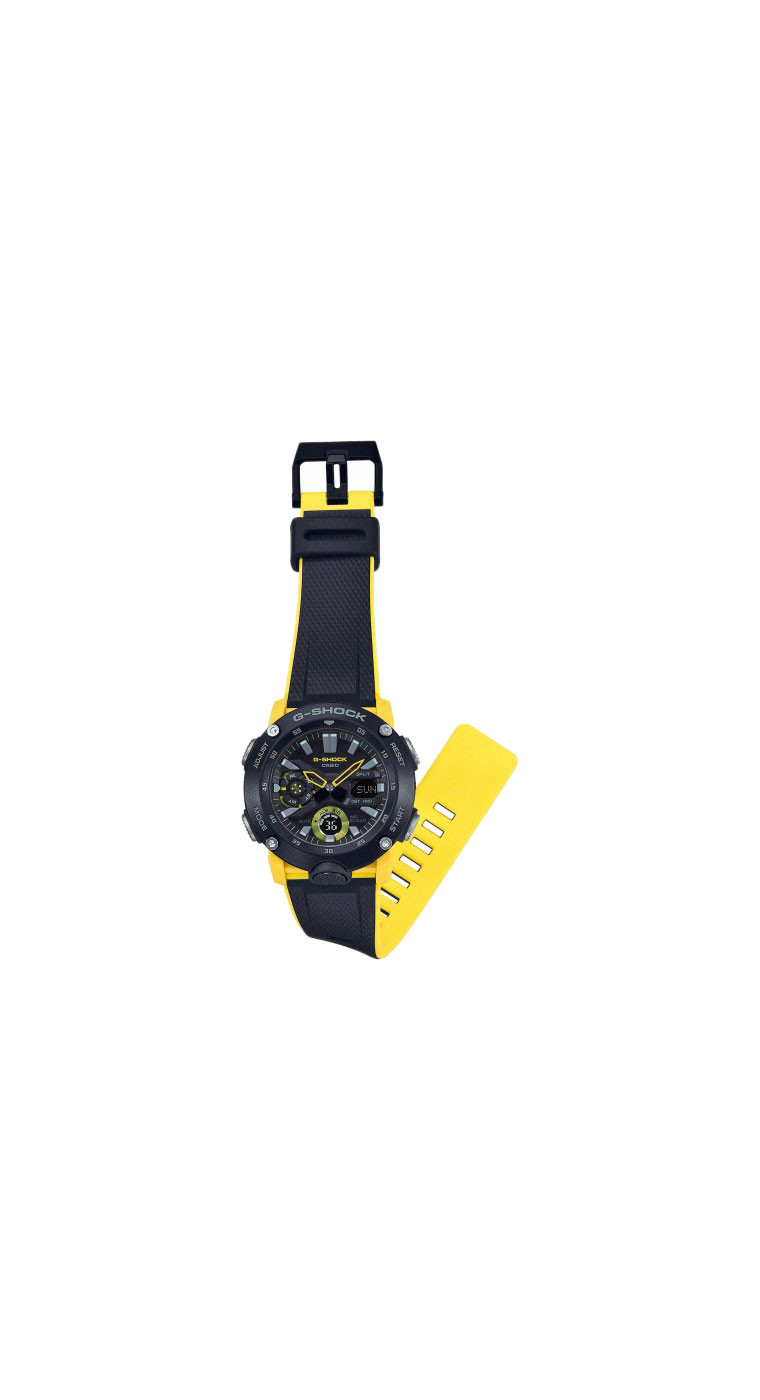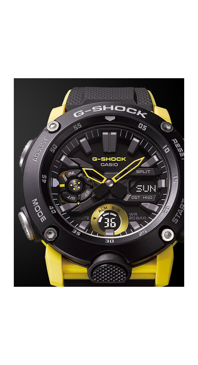 Перед вами релиз 2019 года в новом корпусе GA-2000. В часах используется технология Carbon Core Guard: модуль часов защищает легкий и сверх-прочный полиуретановый корпус с углеродным армированием, а циферблат покрыт закаленным минеральным стеклом. Модель выполнена в черном цвете с инверсионными дисплеями и яркими желтыми стрелками, что обеспечивает высокую эргономику при использовании. Еще одна особенность часов — обновленное крепление ремешка, теперь его смена займет у вас всего несколько секунд.
