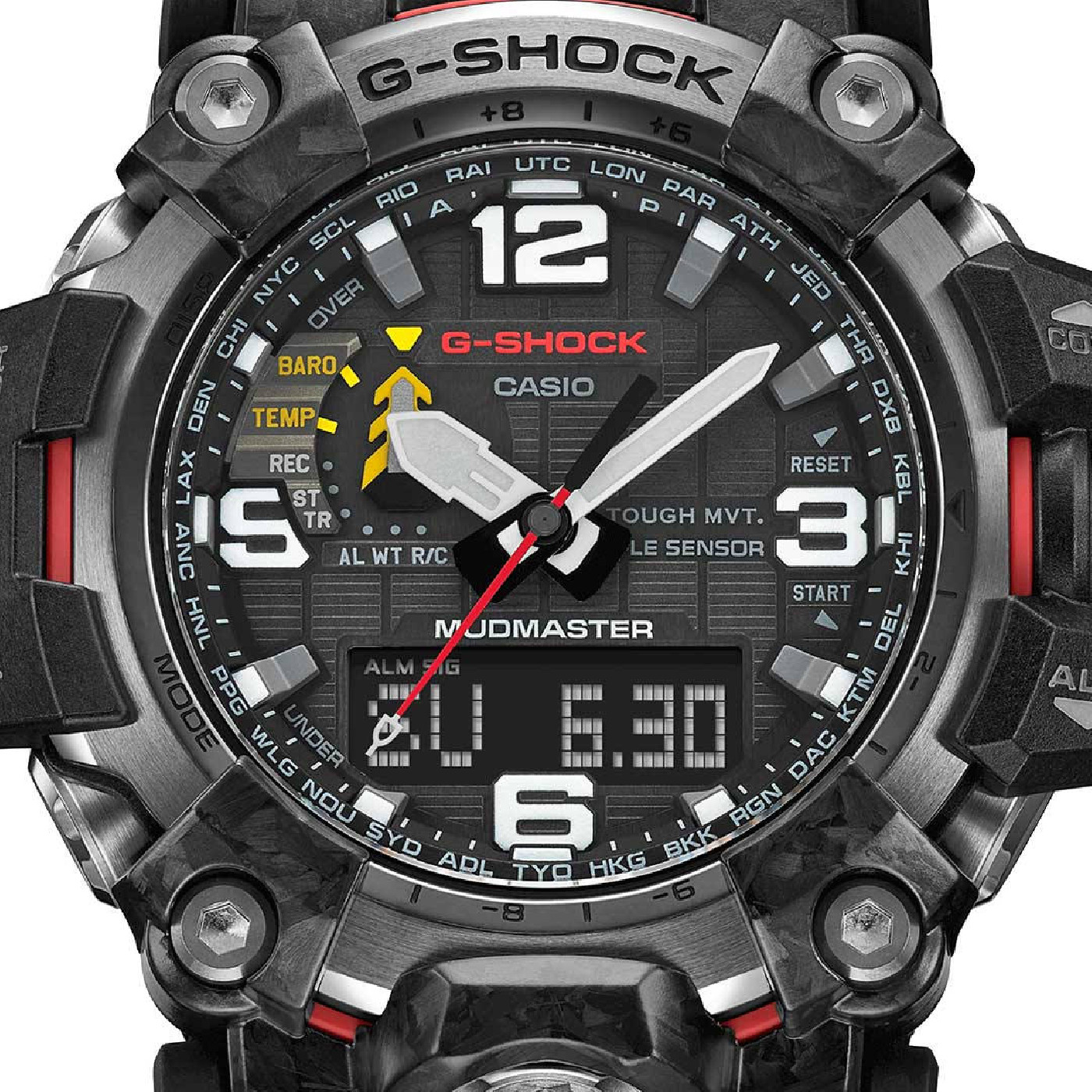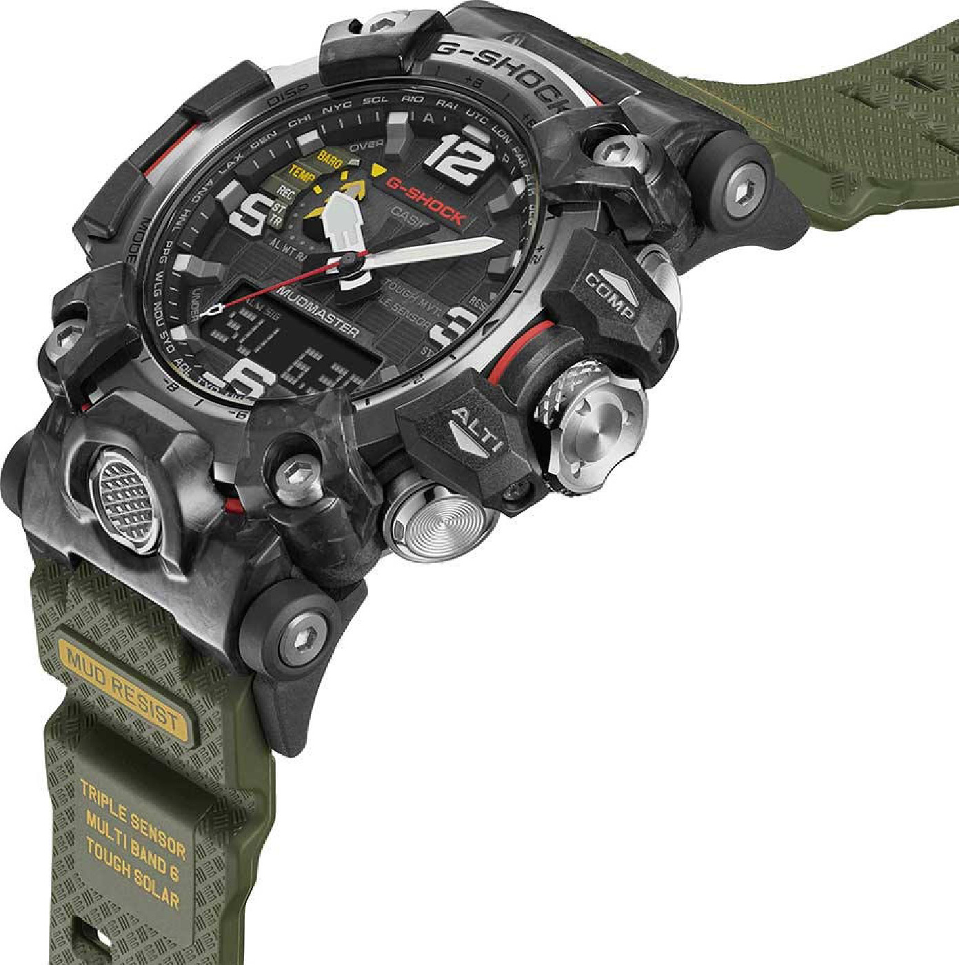 Мужские кварцевые часы на солнечной батарее из серии G-Shock Mudmaster. Противоударный серый карбоновый корпус со стальным кольцом. Черный циферблат. Сапфировое стекло. Водозащита 200м. Зеленый ремешок из полимерного материала с классической пряжкой. Компания CASIO представляет пополнение своей профессиональной коллекции Master of G - новую модель в рамках серии MUDMASTER, созданной для "покорителей Земли" и отличающуюся повышенной защитой от попадания грязи и пыли, - часы GWG-2000. Модель GWG-2000 унаследовала многое от своих предшественника - модели GWG1000. Новые технологии при создании корпуса на базе использования углеродного волокна позволили применить новую технологию строения корпуса "Carbon Core Guard". Использование кованого карбона и применение углеродно-усиленных полимеров позволило создать более компактный корпус в сравнении с предшественником.