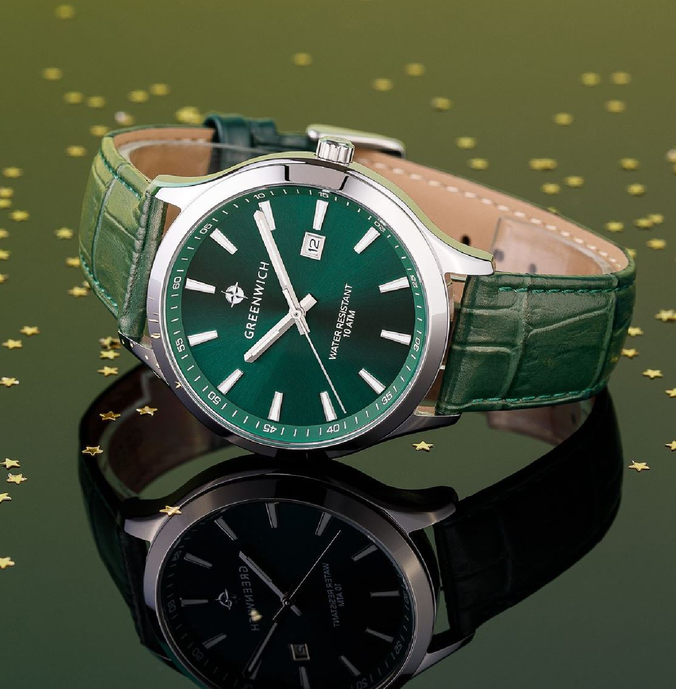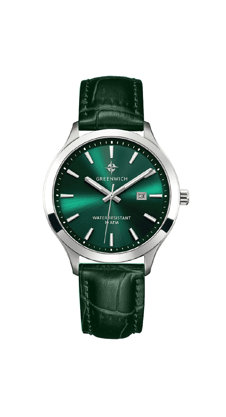 Массивный корпус часов с полированным безелем сделан из гипоаллергенной нержавеющей стали. Она обладает антимагнитным эффектом, повышая, таким образом, точность работы кварцевого механизма. Полированный циферблат изумрудного оттенка вмещает крупные часовую и минутную стрелки. Хорошо читается и секундная стрелка, которая отсчитывает секунды по маркированному кругу. Индикатор в положении «3 часа» показывает дату. Надежный японский механизм обеспечивает бесперебойную работу. О качестве часов говорит повышенная водостойкость — 10 атмосфер. Модель дополняет ремешок из натуральной кожи темно-зеленого цвета. Бренд Greenwich отличается вниманием к деталям. На заводной головке и задней крышке расположился логотип: стилизованное изображение розы ветров. На задней крышке — гравировка корабля, идущего навстречу приключениям.