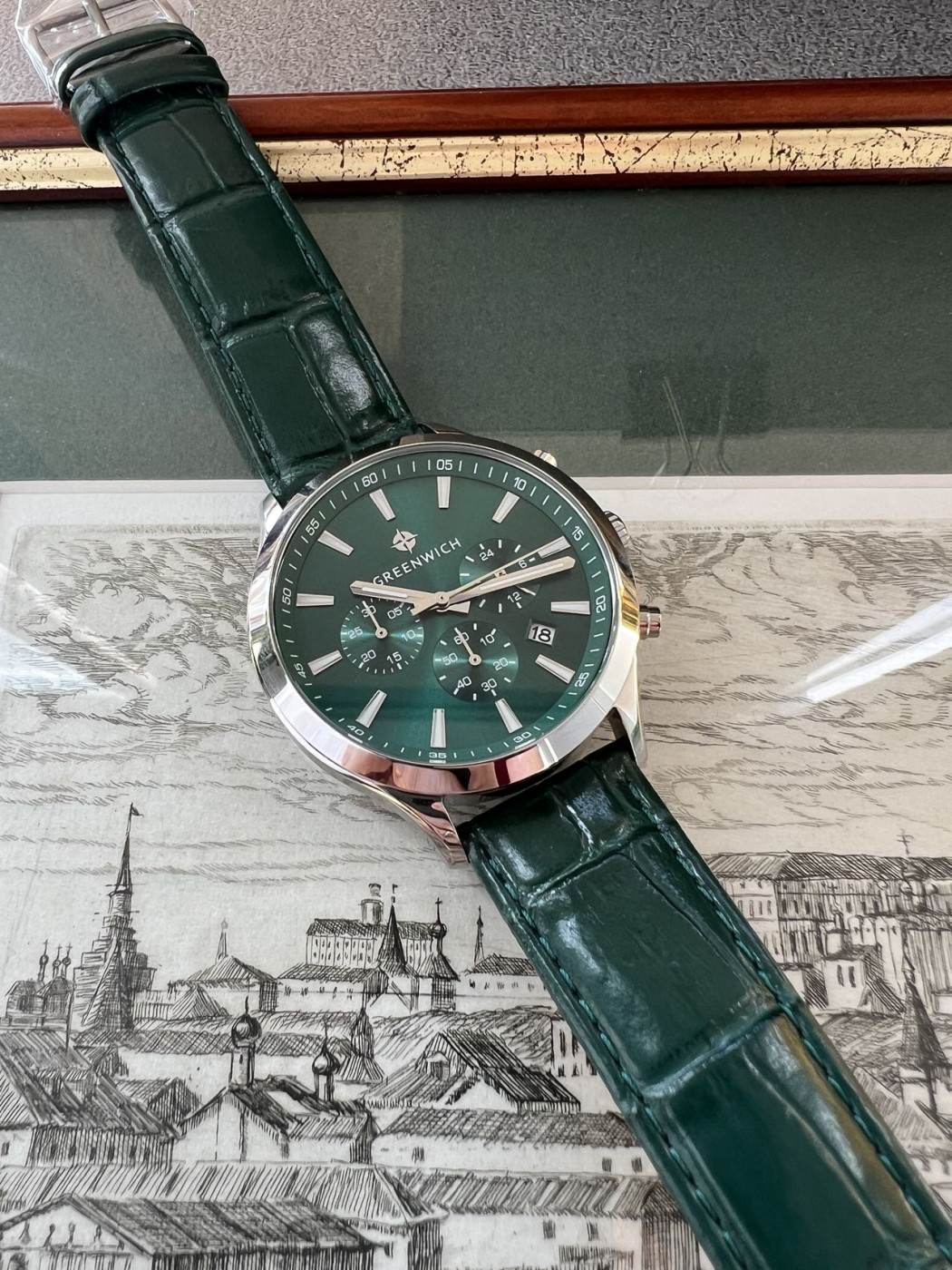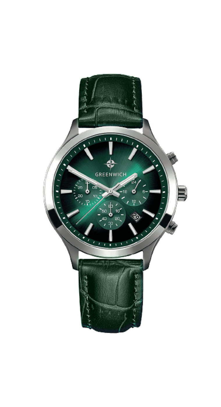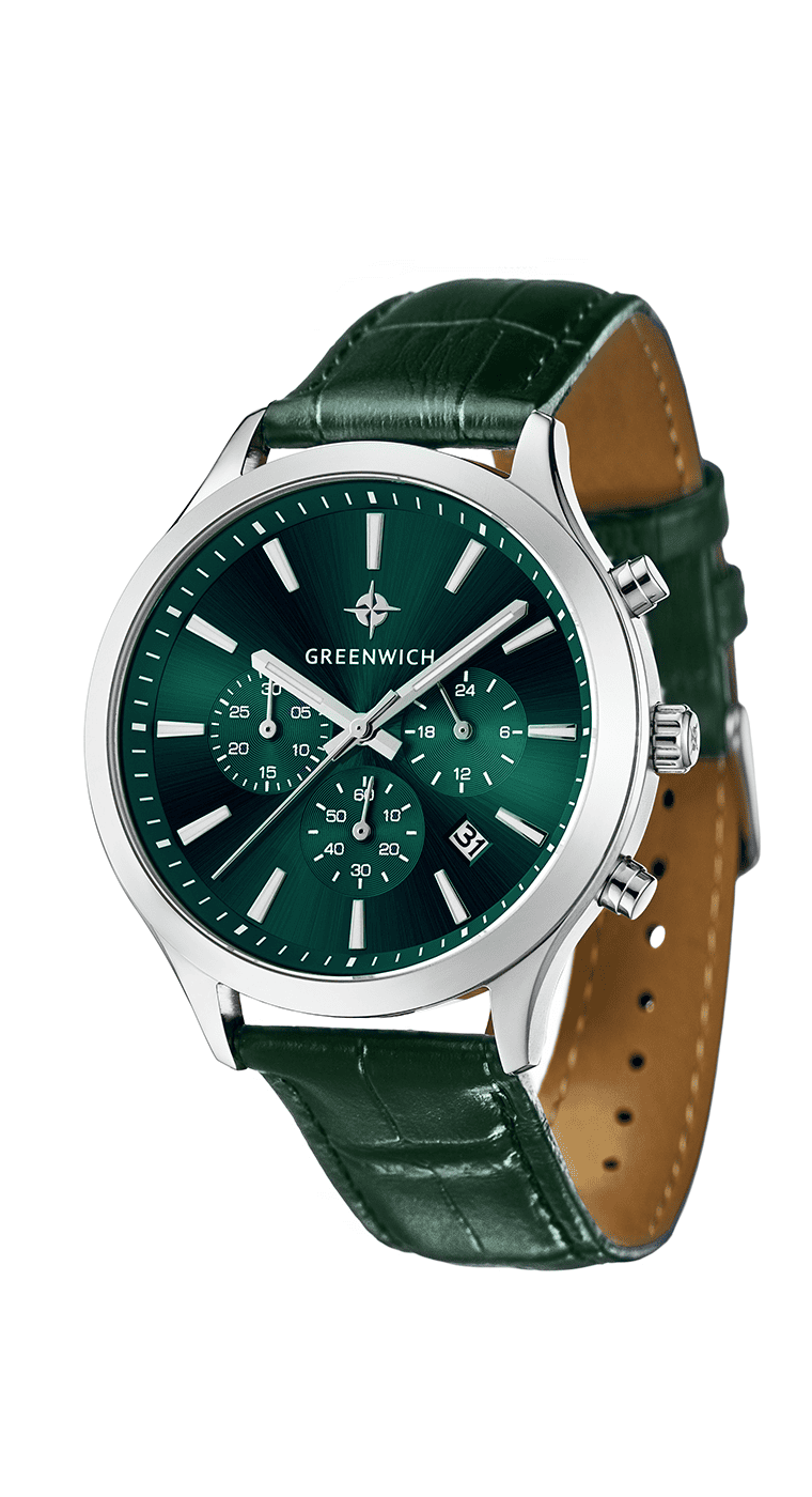Классический хронограф серии Skipper смотрится модно и актуально. Корпус часов из гипоаллергенной нержавеющей стали хорошо подходит для ежедневного контакта с кожей. Диаметр корпуса равен 42 мм: достаточно массивный, чтобы украсить мужское запястье. Он, в тоже время, не будет доставлять неудобств, если вы наденете эти часы с рубашкой или любой другой одеждой с длинными рукавами. На читаемом циферблате изумрудного оттенка легко определить не только время с точностью до секунды. Вы можете воспользоваться дополнительными индикаторами: 24-х часов, даты, счетчиками минут и секунд. В положении «5 часов» находится окошко даты. Крупные кнопки хронографа и рифленая заводная головка удобны в использовании. Надежный японский механизм обеспечивает бесперебойную работу. Повышенная водостойкость (10 атмосфер) означает, что в часах можно плавать. В часах установлено прочное минеральное стекло. Часы комплектуются ремешком из натуральной кожи темно-зеленого цвета.