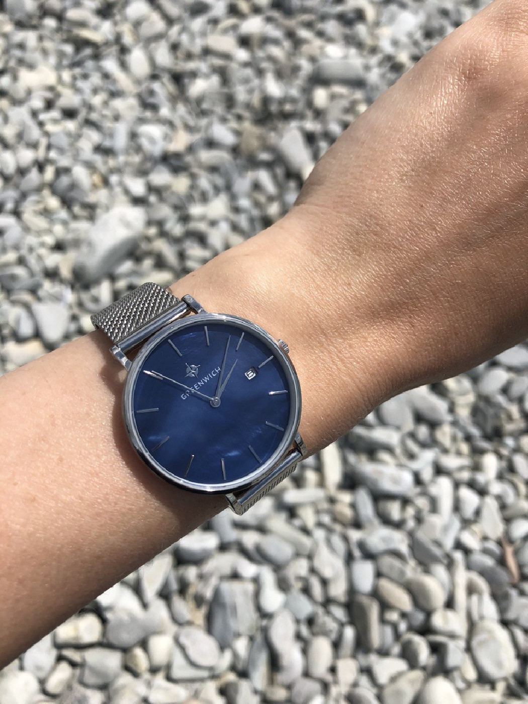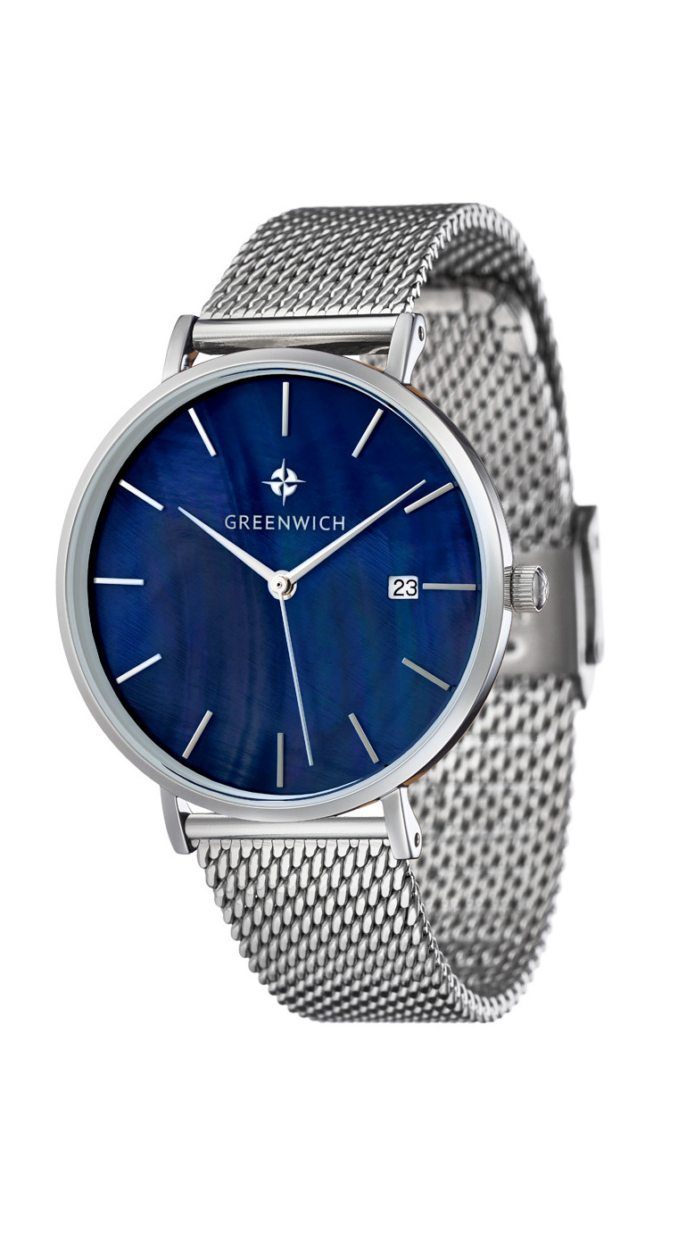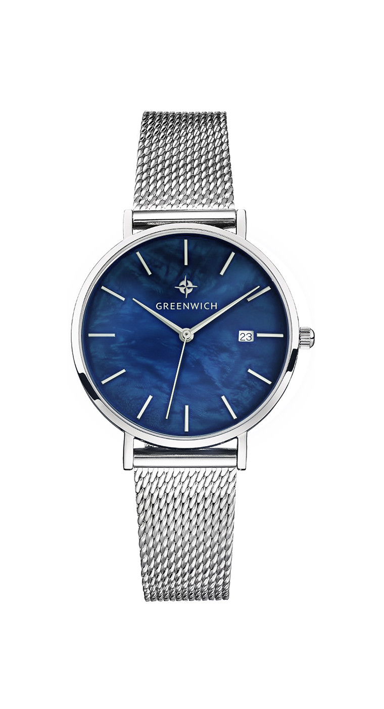 Лаконичность часов Shell не выглядит упрощенной: это красивый женственный аксессуар, обладающий собственной изюминкой: циферблатом из натурального перламутра синего цвета. Его переливы подчеркивают изысканность образа, а вариативность палитры гарантирует, что такая модель подойдет под гардероб любой расцветки. Изящный корпус диаметром 35 мм выполнен из нержавеющей стали. К накладным индексам и стрелкам прилагается еще одна полезная функция: текущая календарная дата, свериться с которой можно, взглянув на квадратное окошко, вынесенное в положение «3 часа». Дополняет образ стальной браслет миланского плетения с удобной застежкой — она поможет легко отрегулировать длину браслета.