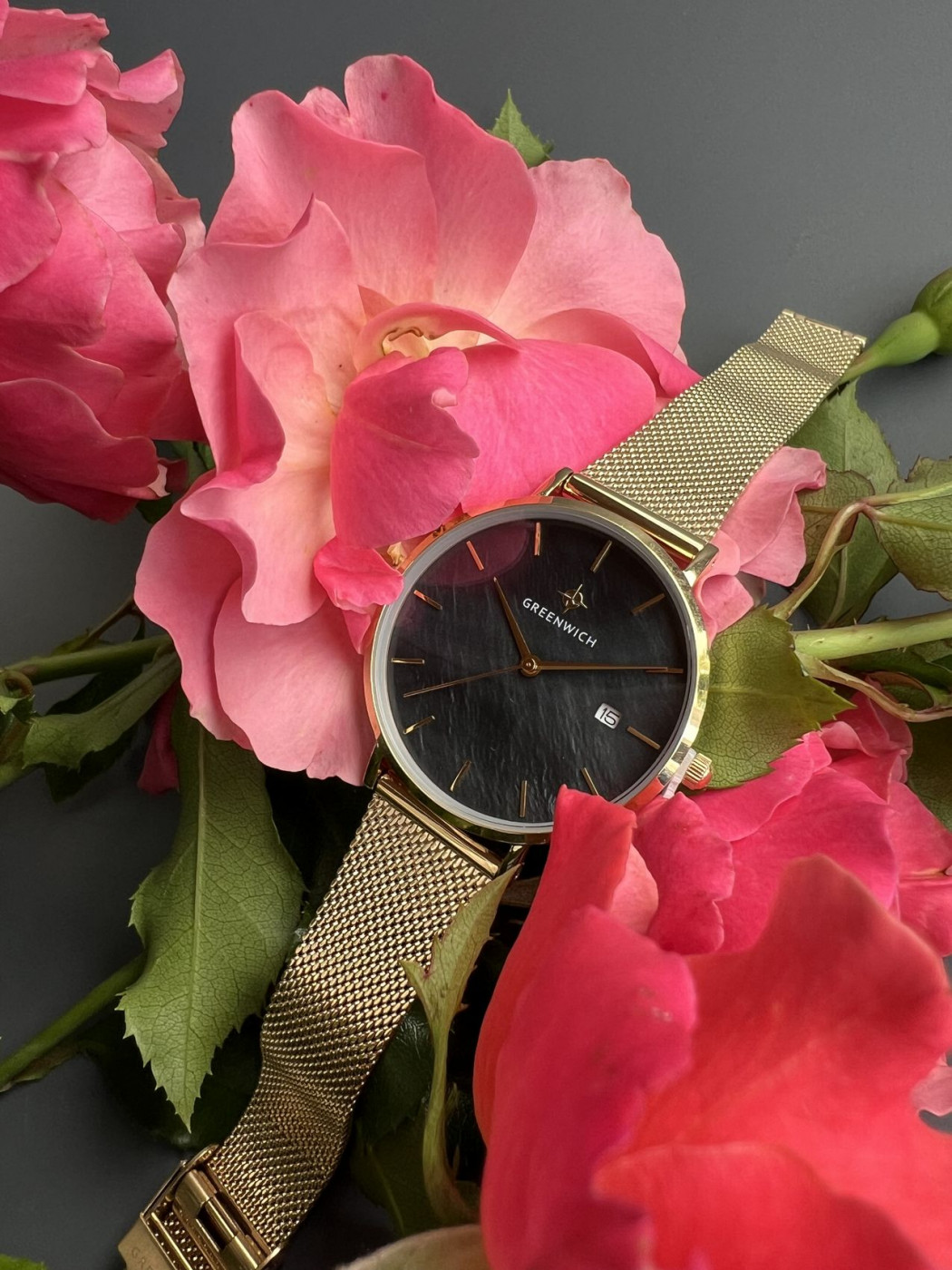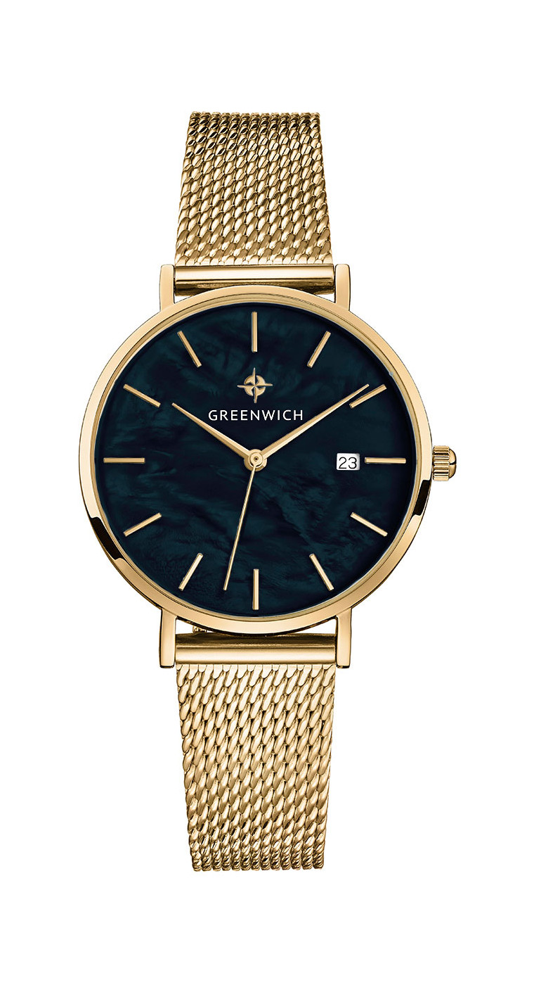 Лаконичность часов Shell не выглядит упрощенной: это красивый женственный аксессуар, обладающий собственной изюминкой: циферблатом из натурального перламутра черного цвета. Его переливы подчеркивают изысканность образа, а вариативность палитры гарантирует, что такая модель подойдет под гардероб любой расцветки. Изящный корпус диаметром 35 мм выполнен из нержавеющей стали c PVD-покрытием из желтого золота. К накладным индексам и стрелкам прилагается еще одна полезная функция: текущая календарная дата, свериться с которой можно, взглянув на квадратное окошко, вынесенное в положение «3 часа». Дополняет образ стальной браслет миланского плетения с удобной застежкой — она поможет легко отрегулировать длину браслета.