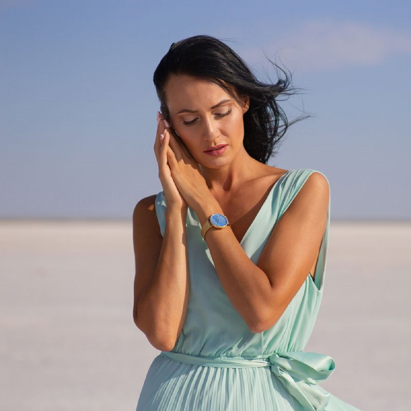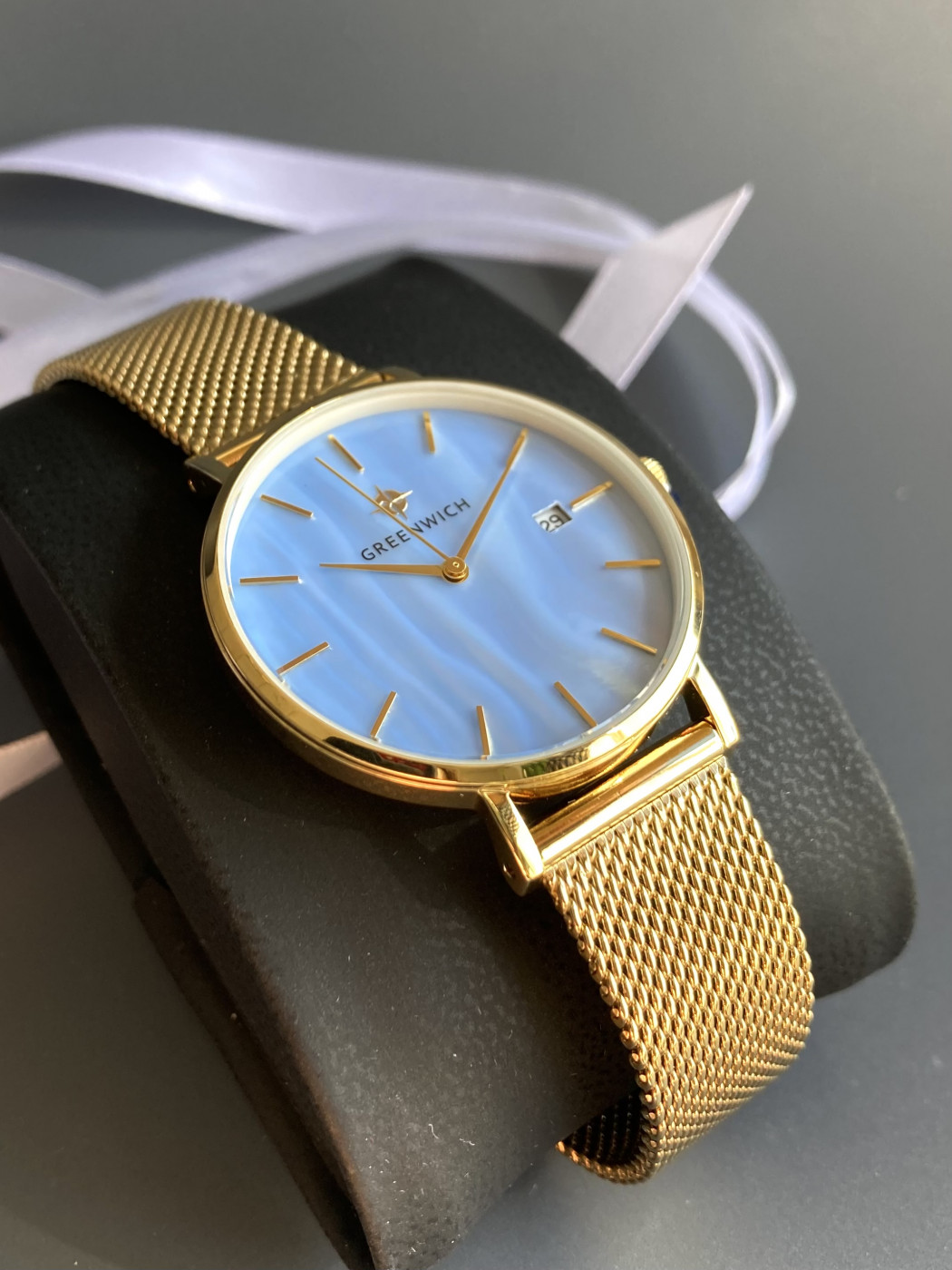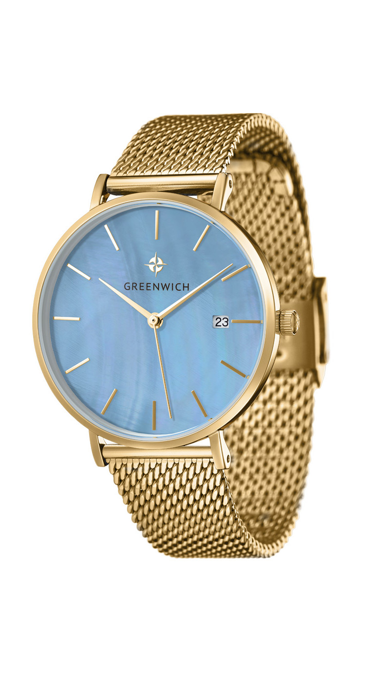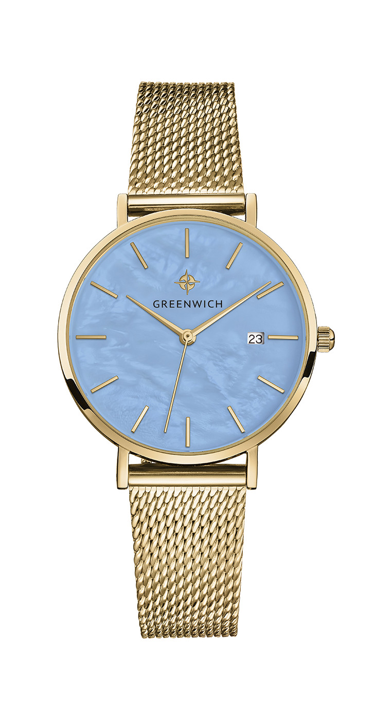 Лаконичность часов Shell не выглядит упрощенной: это красивый женственный аксессуар, обладающий собственной изюминкой: циферблатом из натурального перламутра нежно-голубого оттенка. Его переливы подчеркивают изысканность образа, а вариативность палитры гарантирует, что такая модель подойдет под гардероб любой расцветки. Изящный корпус диаметром 35 мм выполнен из нержавеющей стали с PVD-покрытием из желтого золота. К накладным индексам и стрелкам прилагается еще одна полезная функция: текущая календарная дата, свериться с которой можно, взглянув на квадратное окошко, вынесенное в положение «3 часа». Дополняет образ стальной браслет миланского плетения с удобной застежкой — она поможет легко отрегулировать длину браслета.