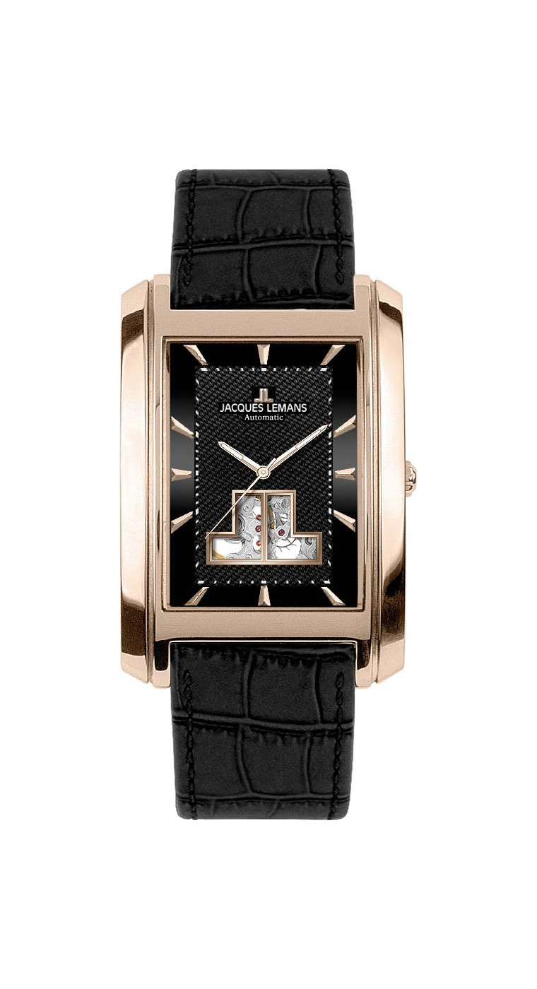 Для корпуса часов 1-1368, сделанного из нержавеющей стали с PVD-покрытием из розового золота, дизайнеры выбрали модную форму прямоугольника. Благодаря эргономичным ушкам корпус удобно ложится на запястье. На черном циферблате часов, центральную зону которого украшает традиционный рисунок гильоше, реализована оригинальная идея по оформлению открытого баланса: он сделан в виде двух латинских букв, J и L, логотипа бренда Jacques Lemans. Часовая и минутная стрелки покрыты люминесцентным составом, чтобы легко читаться даже в темноте. Задняя крышка прозрачная, закреплена на четырех винтах. Часы установлены на ремешок из натуральной кожи черного цвета. Автоматические часы 1-1368 – классика, модная вне зависимости от капризов моды, это статусный аксессуар, уместный как в ансамбле с деловым костюмом, так и с более расслабленным образом в повседневном стиле.