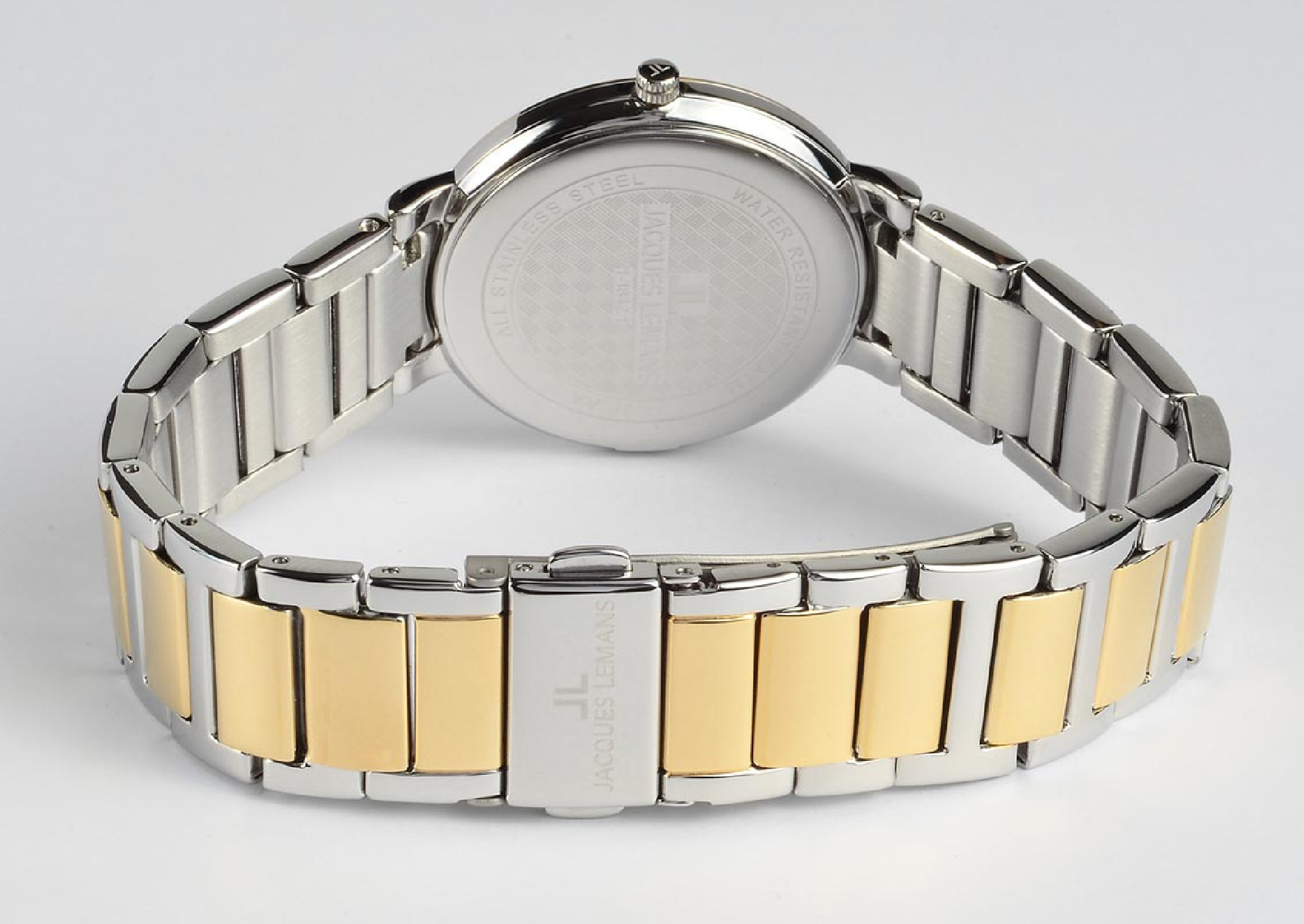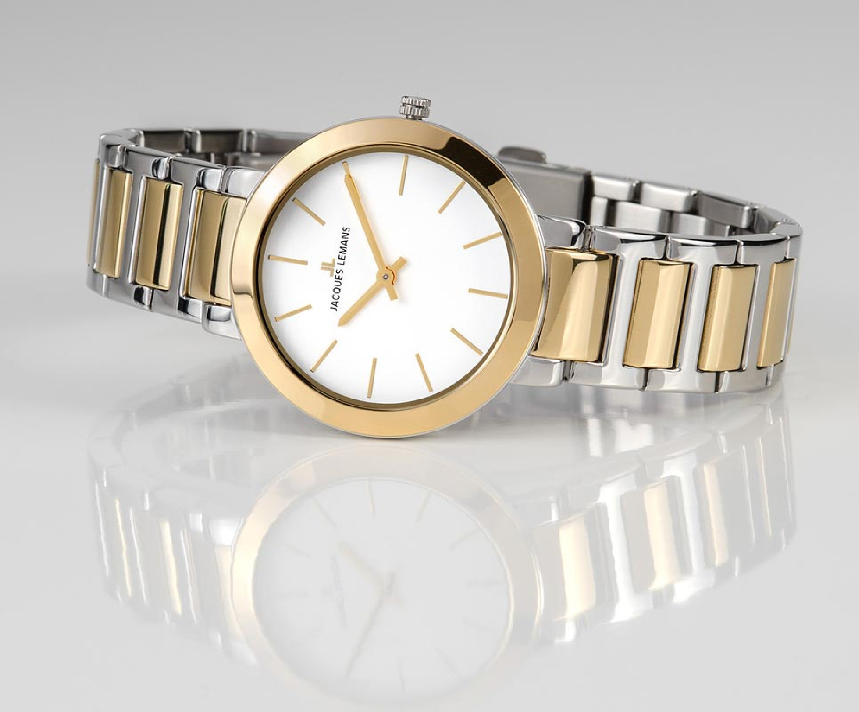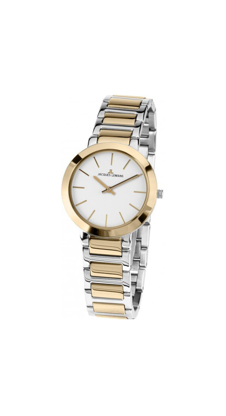 Женские часы из серии Milano от Jacques Lemans впечатляют элегантной простотой. Корпус из нержавеющей стали с диаметром 32 мм. На минималистичном циферблате белого цвета — хорошо читаемые тонкие риски. В кварцевой модели установлено ударопрочное минеральное стекло Crystex. Водостойкость равна 5 АТМ. Браслет из литых стальных звеньев с раскладывающейся застежкой прекрасно сочетается с общим дизайном модели. Элементы корпуса и браслета дополнены PVD-покрытием из желтого золота. Эти стильные часы идеально подойдут для любого выбранного вами образа.