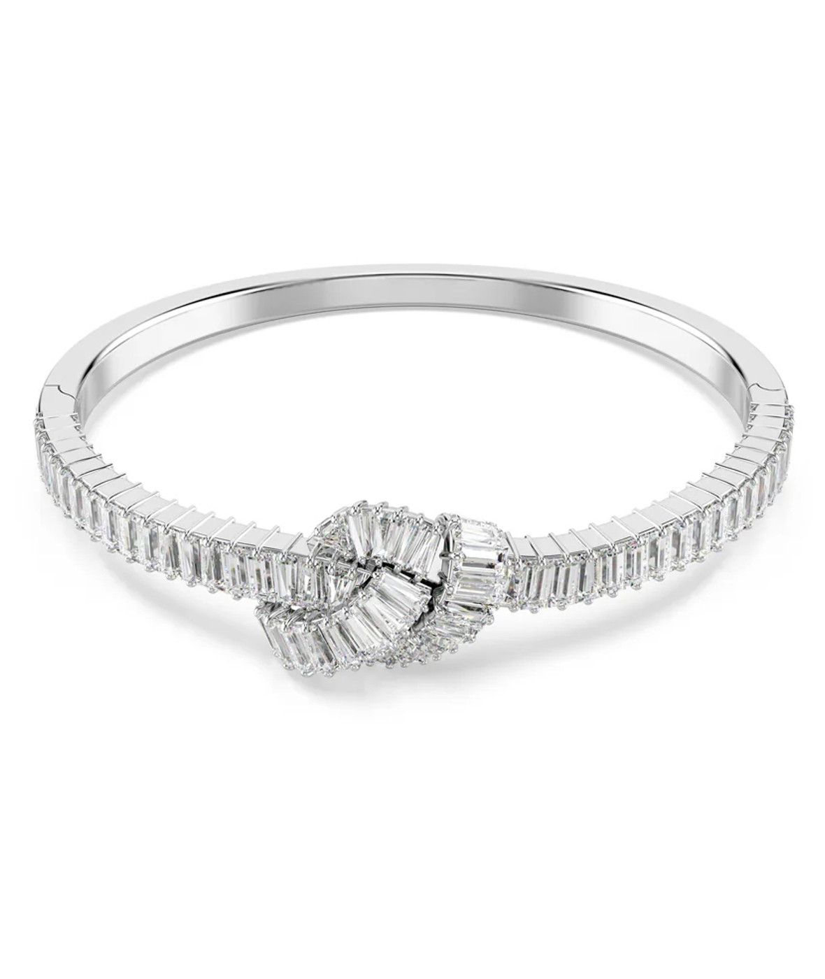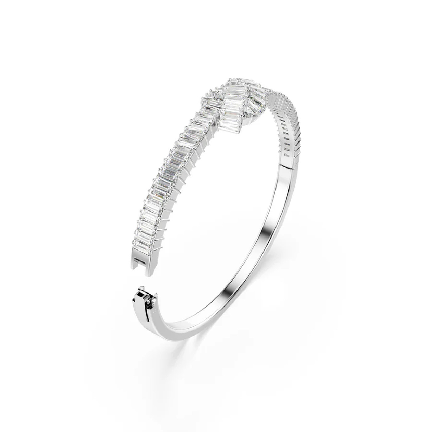 Этот браслет Swarovski искусно сплетен в пленительный узелок света. Дизайн, вдохновленный лентой, покрыт родием и украшен изысканным украшением из кристаллов Swarovski багетной огранки, каждый из которых закреплен в крапановой оправе. Этот изящный браслет станет ярким акцентом на запястье и прекрасно дополнит другие украшения в тон, создавая завершенный образ.
