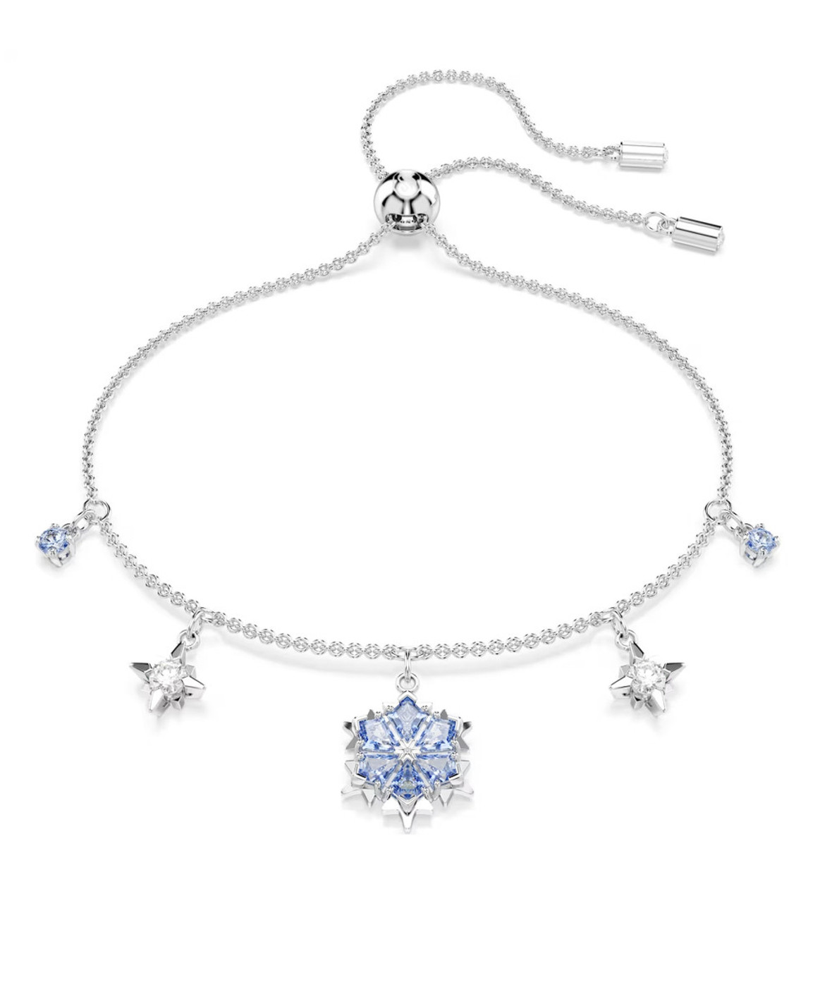 Этот браслет великолепно воплощает в себе снежинку Swarovski в блестящем гранёном стиле. Дизайн с родиевым покрытием украшен синими кристаллами Swarovski, образующими пять зимних мотивов на тонкой цепочке с регулируемой скользящей застежкой. Прекрасное дополнение к вашей ювелирной коллекции или идеальный подарок.