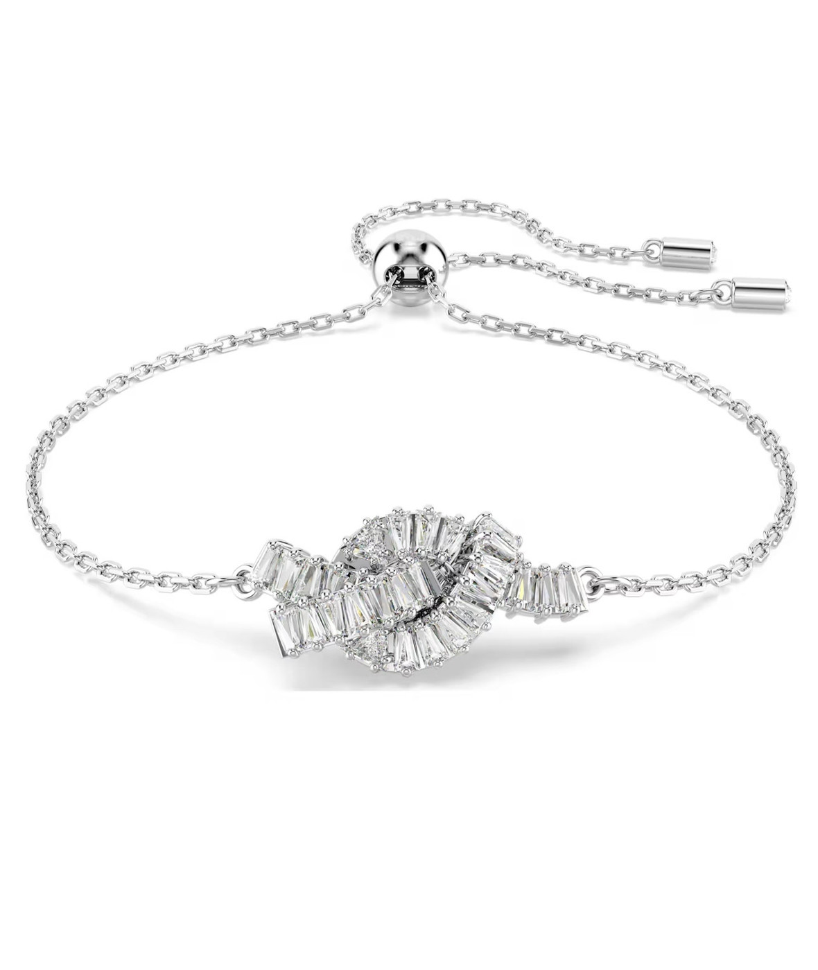 Этот браслет – чистое воплощение света и единства. Изготовленное с помощью узла в виде ленты, дизайн с родиевым покрытием украшен изысканными кристаллами Swarovski багетной огранки, каждый из которых закреплён в крапановой оправе, а регулируемая застёжка-слайдер подходит для любого размера запястья. Изящный и элегантный, он станет прекрасным дополнением к другим украшениям из той же коллекции.