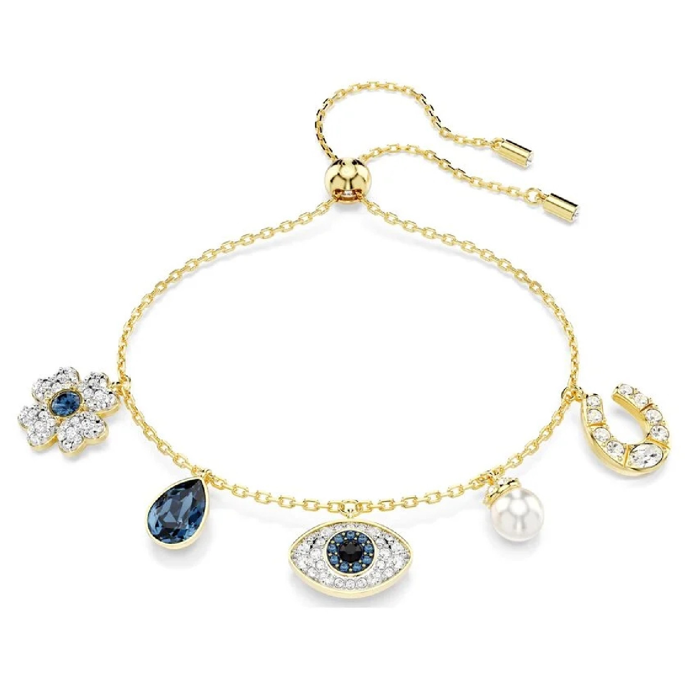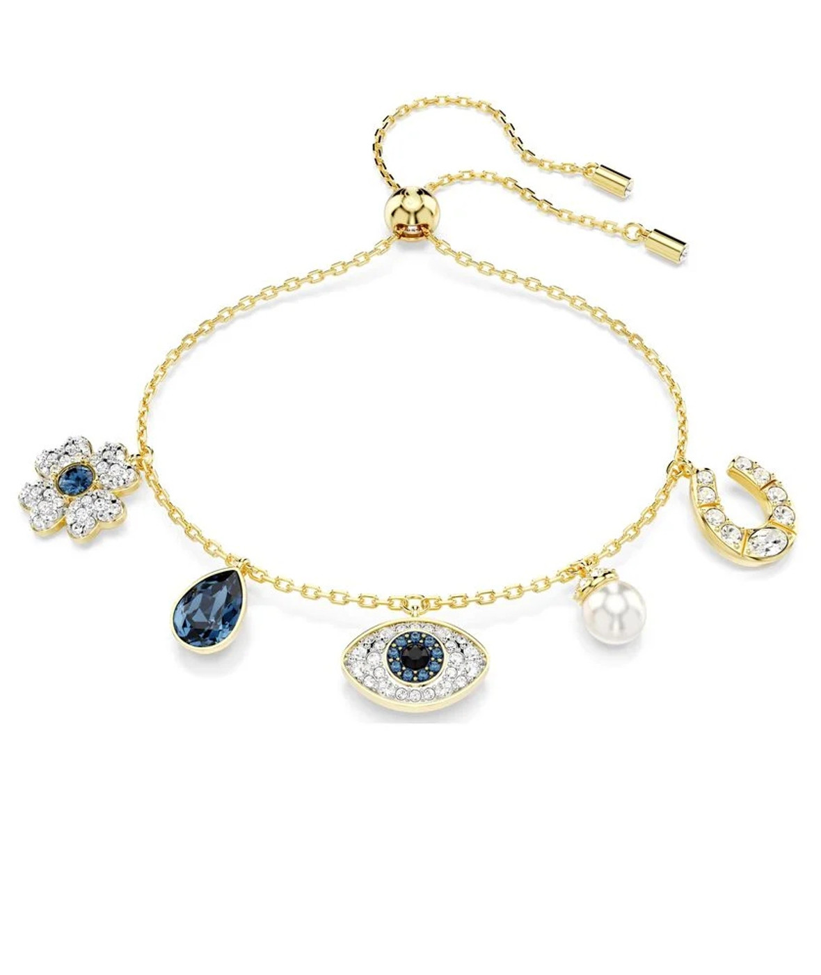 Наполните свой стиль магией и мистицизмом с этим выразительным браслетом золотого оттенка. Украшение представляет собой изящную цепочку с пятью символами, включая четырехлистный клевер, синюю грушевидную каплю, кристальную жемчужину Swarovski с паве, счастливую подкову и дурной глаз в центре. Каждый элемент украшен кристаллами, чтобы создать мерцающее символическое украшение. Сочетайте с подходящими серьгами для смелого образа в стиле бохо.