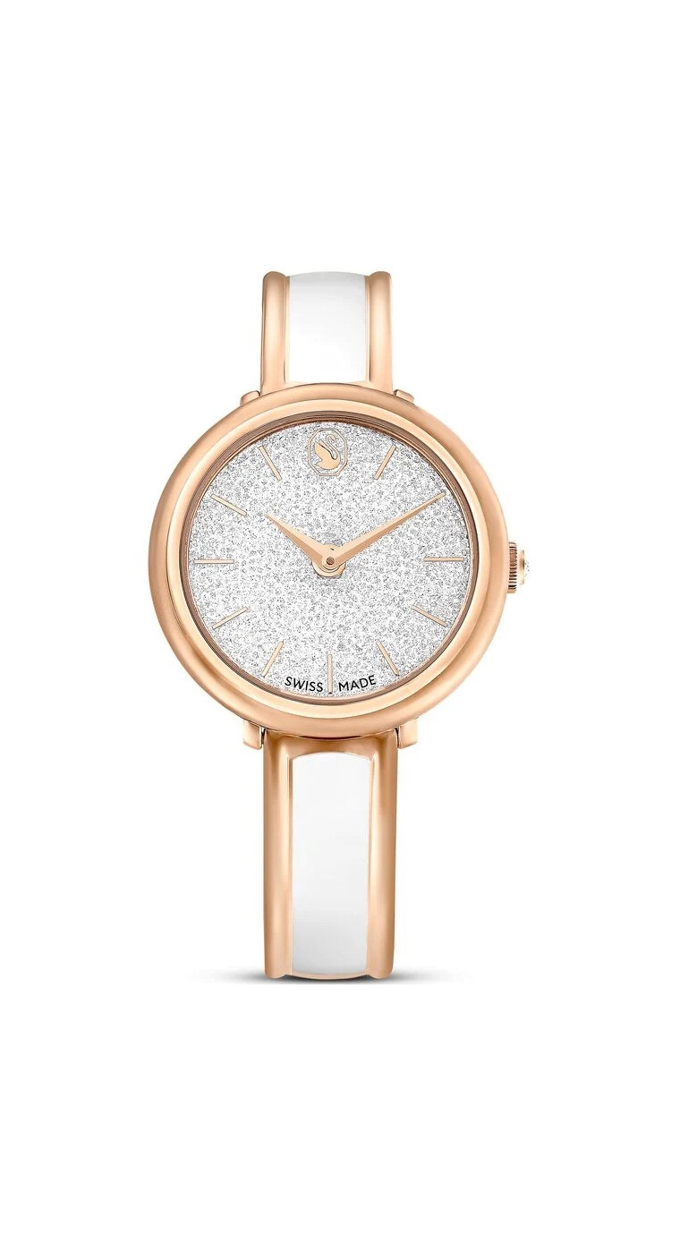Эти хрустальные часы-браслет, которые одновременно являются и ювелирным изделием, и часами, являются великолепным повседневным аксессуаром. Корпус из нержавеющей стали диаметром 32 мм выполнен в оттенках розового золота и надевается на запястье на регулируемый браслет с элегантной серединкой из белой эмали. Великолепный образец хрустальной техники Swarovski - циферблат украшен примерно 1016 кристаллами, которые переливаются между тонкими часовыми метками и логотипом Swan в положении "12 часов". Дополнительный кристалл также расположен внутри заводной головки. Эти швейцарские часы обладают водонепроницаемостью до 50 метров и демонстрируют безупречный стиль в любое время суток.