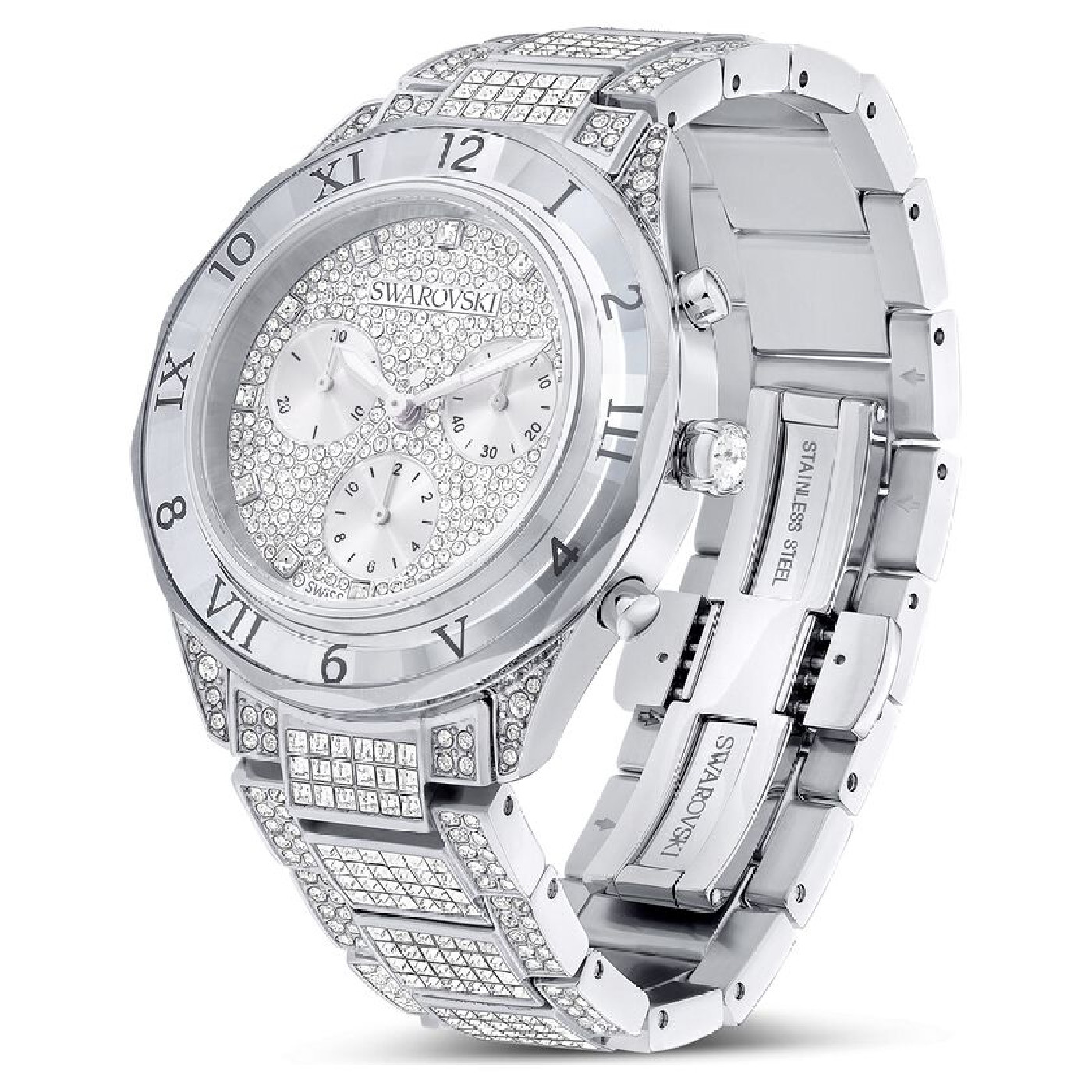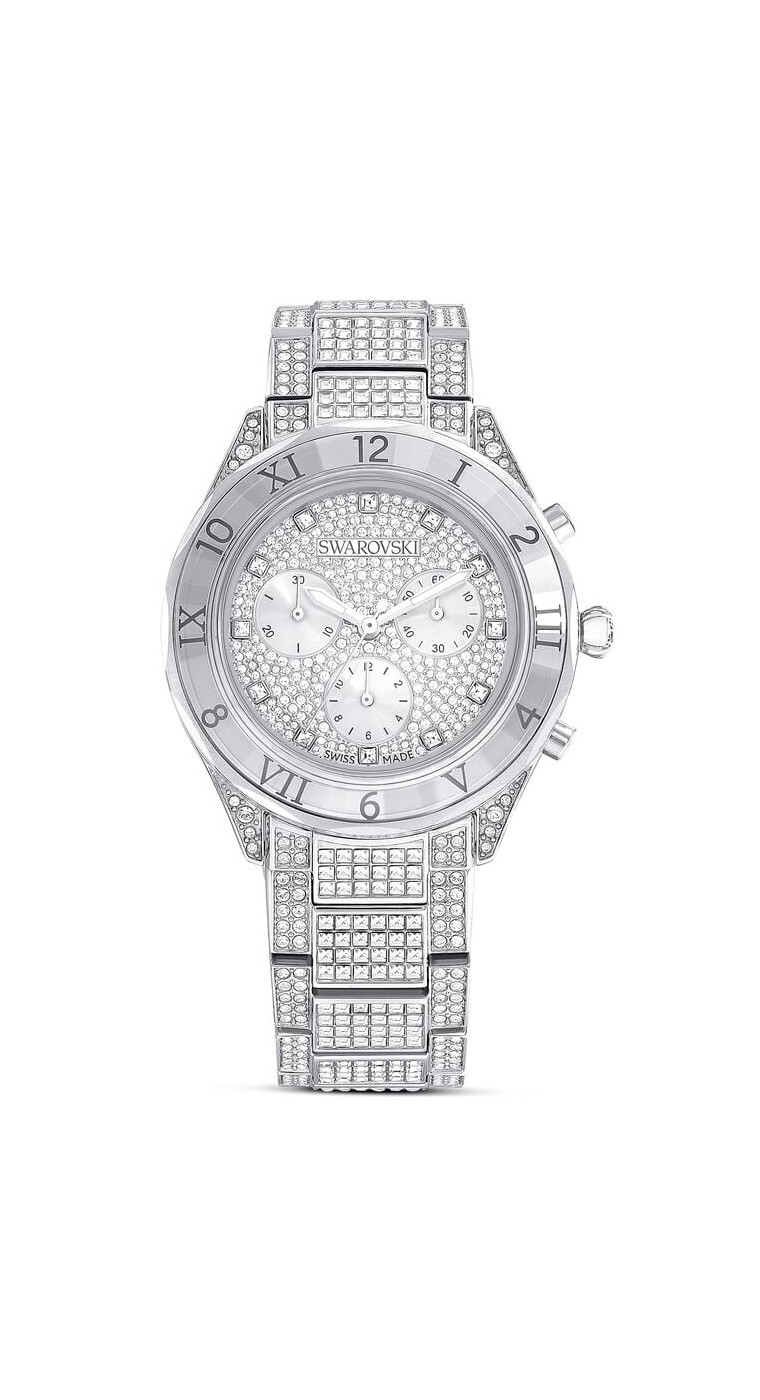 Корпус выполнен из нержавеющей стали, его глубокий эффект усиливается благодаря безелю из кристаллов с метками в виде римских и арабских цифр. Под минеральным стеклом открывается циферблат, декорированный паве из 240 кристаллов круглой огранки. Метки в виде точек, инкрустированных кристаллами Swarovski квадратной огранки. Три счетчика хронографа предназначены для отдельного измерения часов, минут и секунд. Мечевидные стрелки в стиле Sword с люминесцентным покрытием LumiNova, которое светится в темноте после непродолжительной зарядки на свету. Заводная головка украшена кристаллом круглой огранки. Стальной браслет с застежкой-бабочкой украшен 492 кристаллами круглой и квадратной огранки.