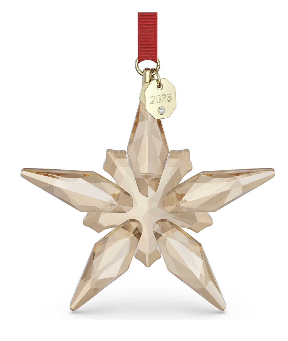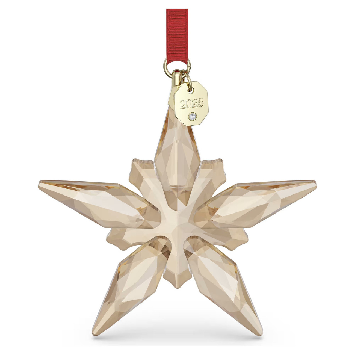 Отпразднуйте одно из традиционных событий сезона с этим украшением Swarovski Annual Edition. Подвешенное на красной ленте из репсовой ленты с акцентами цвета шампанского, это украшение в форме звезды с 190 гранями, точно вырезанными из света, прекрасно воплощает в себе сложную простоту и техническое мастерство Swarovski. Золотистый дизайн дополняет гравировка 2025 на бирке. Это украшение идеально подходит для подвешивания на декоративной ёлке, на окне или в интерьере дома и станет поистине чудесным способом подчеркнуть ваши праздничные моменты. Предмет декора. Не игрушка. Не подходит для детей младше 15 лет.