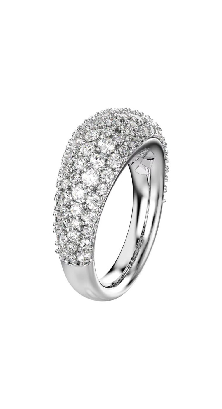 Это куполообразное кольцо с родиевым покрытием, созданное для максимального эффекта, украшено потрясающим декором из прозрачных кристаллов Swarovski, закреплённых в технике шатонаж. Идеально подходит для моментов, когда элегантность и изящество просто необходимы.