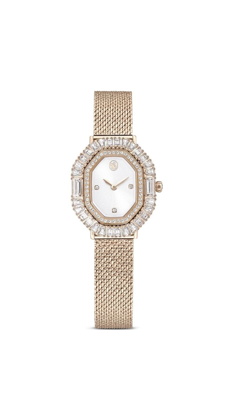 Эти инновационные часы - единственное в своем роде творение, сочетающее фирменный дизайн с мастерским использованием света. Часы, выполненные с подлинным мастерством, вдохновлены ювелирным семейством Matrix и имеют корпус из нержавеющей стали размером 13 x 18 мм с отделкой цвета шампанского под золото. Безель выполнен в фирменной форме восьмиугольника и украшен потрясающим сочетанием 78 кристаллов круглой и причудливой огранки и циркония Swarovski. Это создает сияющую рамку для минималистичного циферблата sunray с тремя часовыми метками из хрусталя и логотипом в виде лебедя. В заводную головку также вставлен монокристалл, а на запястье - регулируемый сетчатый браслет, еще больше подчеркивающий роскошь часов. Водонепроницаемость этих часов достигает 50 м и символизирует современную роскошь Swarovski во всей ее красе.