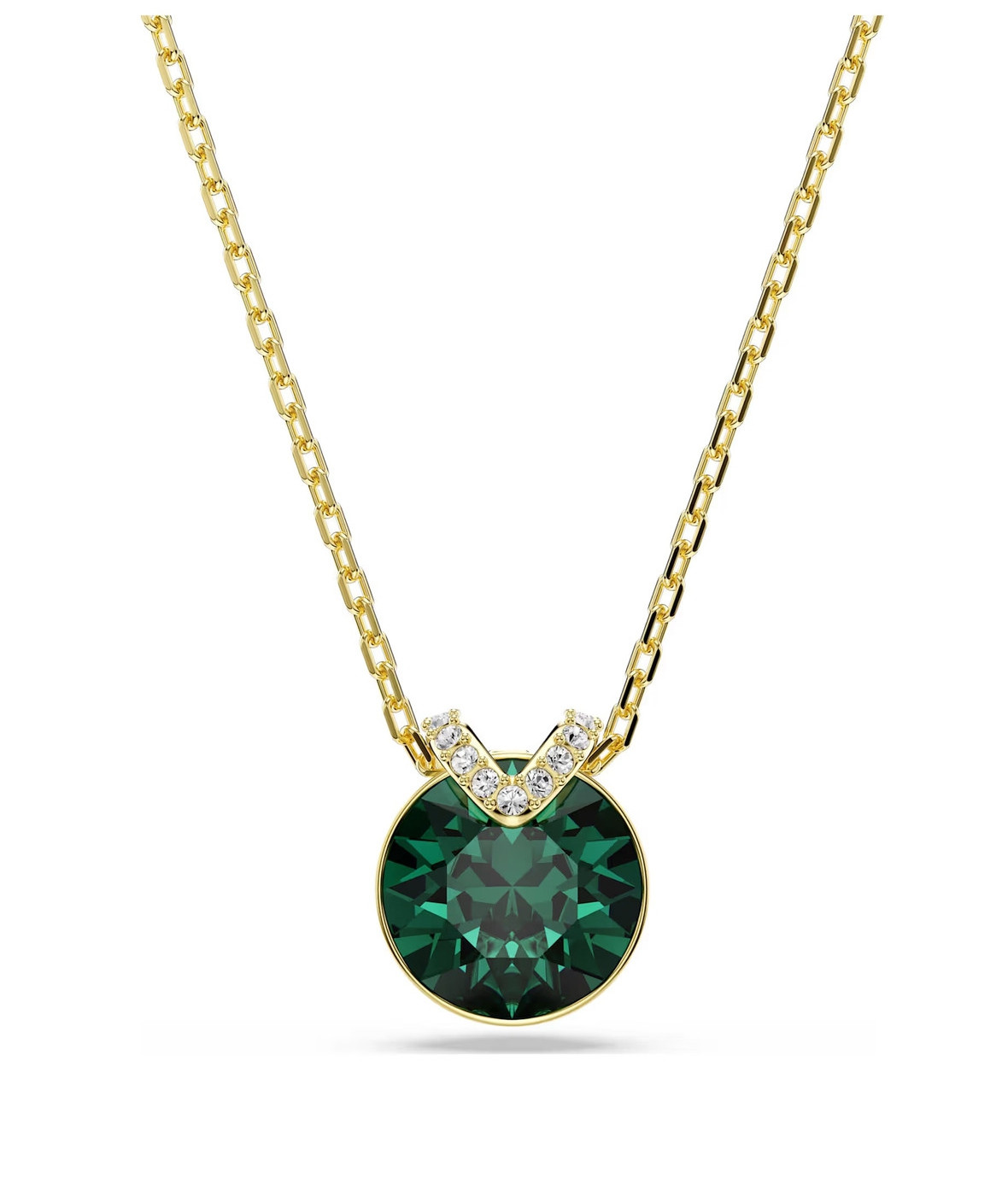 Этот завораживающий кулон V-образной формы притягивает взгляды благодаря центральному зелёному кристаллу. Дизайн с покрытием оттенка цвета желтого золота и россыпь мерцающего паве добавляет ещё больше красоты, а изящная цепочка излучает чистую элегантность. Носите его с подходящими серьгами, чтобы создать чудесное сочетание.