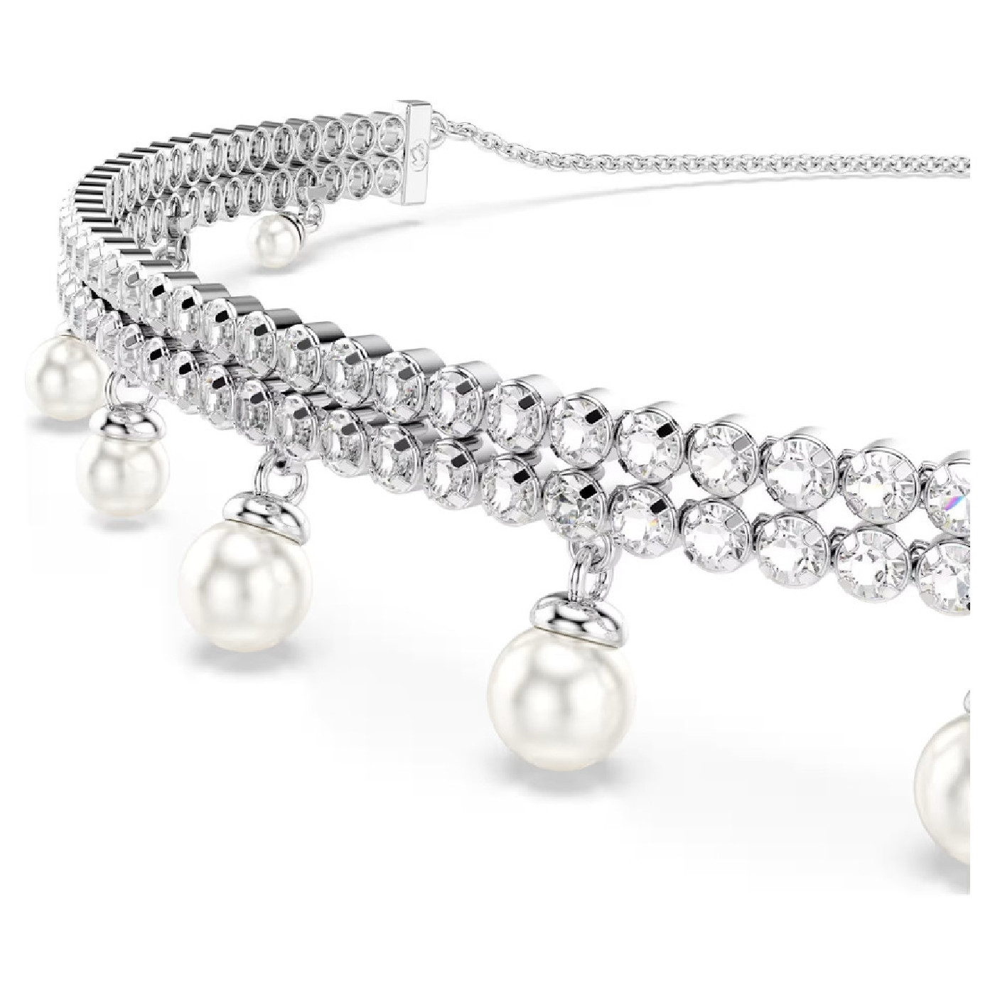Произведите неизгладимое впечатление с этим ярким и экстравагантным чокером. Легко регулируемый с помощью застежки-слайдера, дизайн с родиевым покрытием включает два ряда цепочек, украшенных прозрачными кристаллами Swarovski в круглых огранках. Затем ниже добавляется украшение из кристальных жемчужин Swarovski для сенсационного образа чистой звездной силы. Сочетайте этот чокер с соответствующим браслетом, чтобы создать свою собственную выразительную комбинацию.