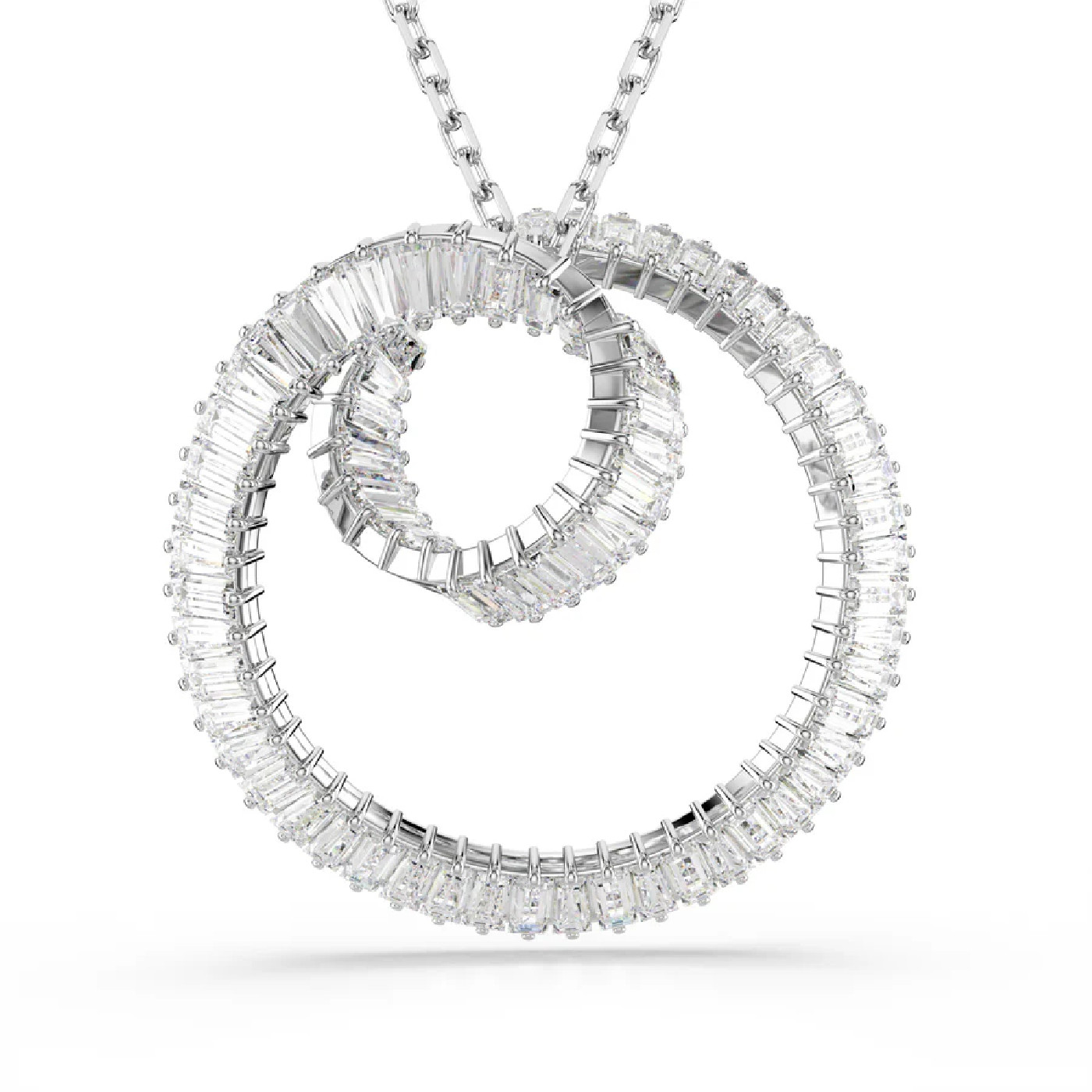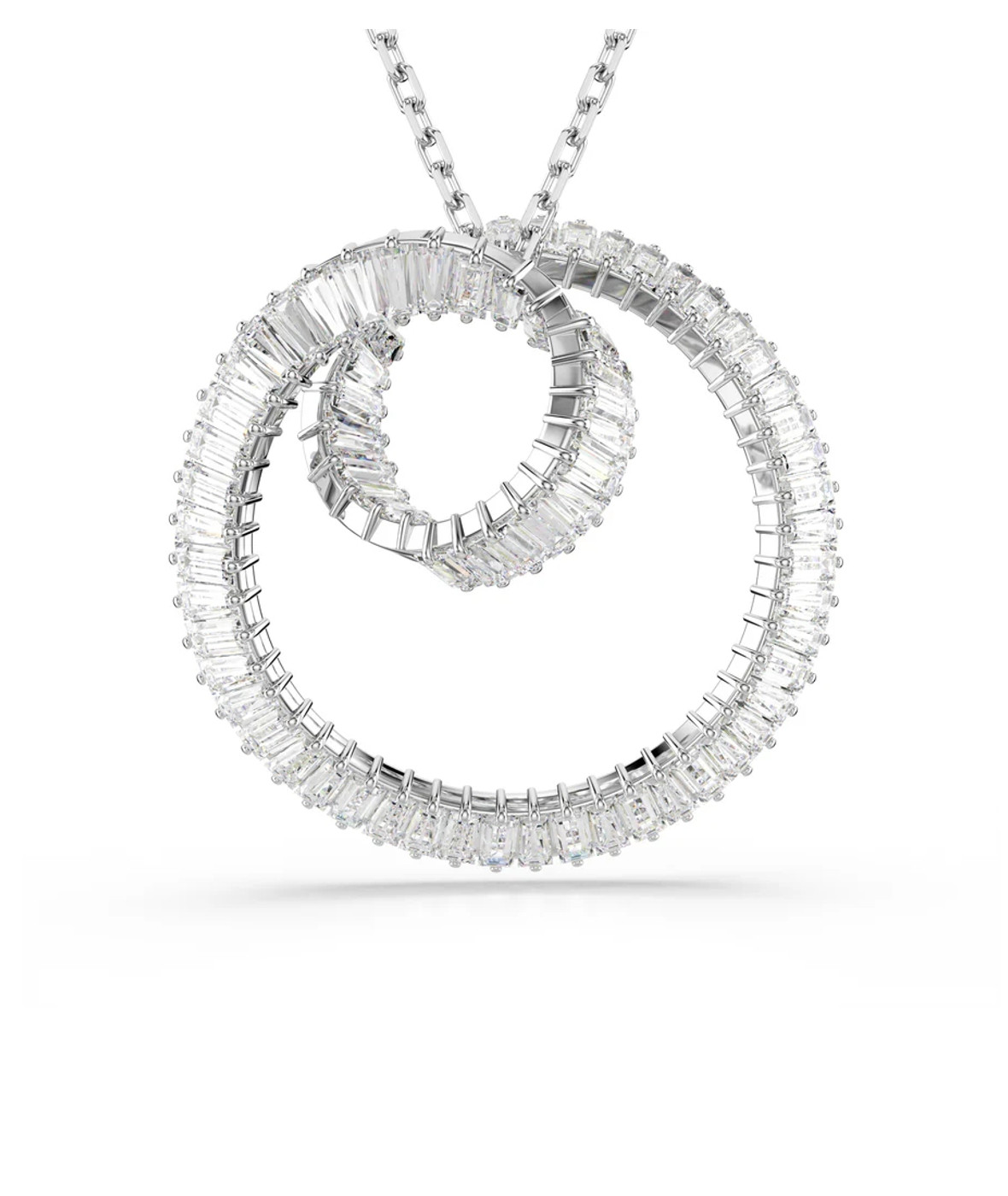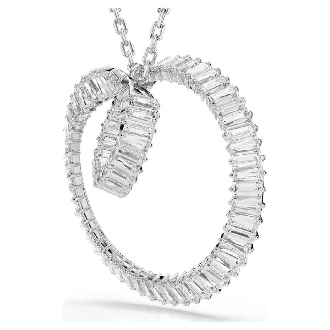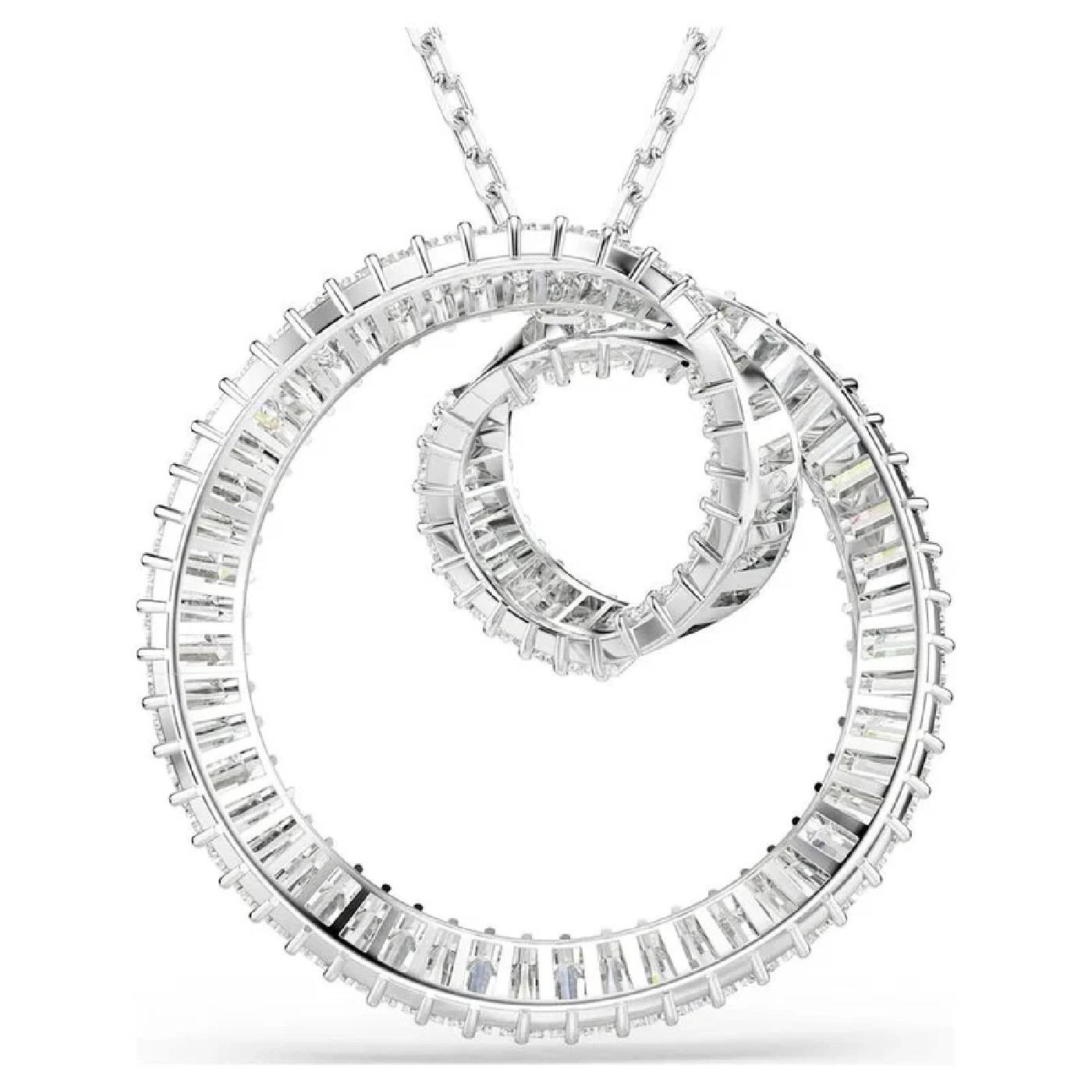 В этом подвесном украшении Matrix, словно в эффектном водовороте света, классическое родиевое покрытие сочетается с мерцающими кристаллами Swarovski. Центральный мотив, подвешенный на длинной цепочке, представляет собой закрученный узор элегантной ленты, созданный из цельной нити багетной огранки в крапановых оправах. Этот кулон – простой способ добавить сияния любому наряду и прекрасно сочетается с подходящими серьгами из той же серии Matrix.
