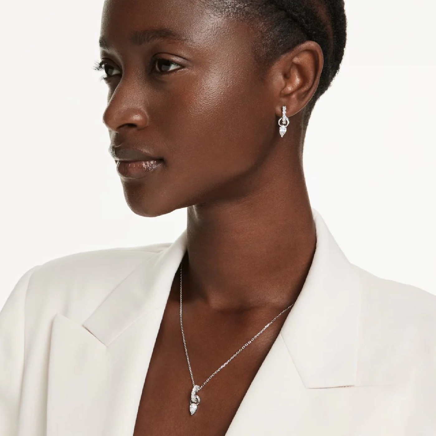 Добавьте сияния в свой стиль с этим комплектом из подвески и серег. Каждый мерцающий мотив украшен грушевидным кристаллом Swarovski на небольшом колечке, которое соединено с другим кольцом с родиевым покрытием, украшенным круглыми кристаллами Swarovski. Длина цепочки легко регулируется с помощью скользящего механизма.