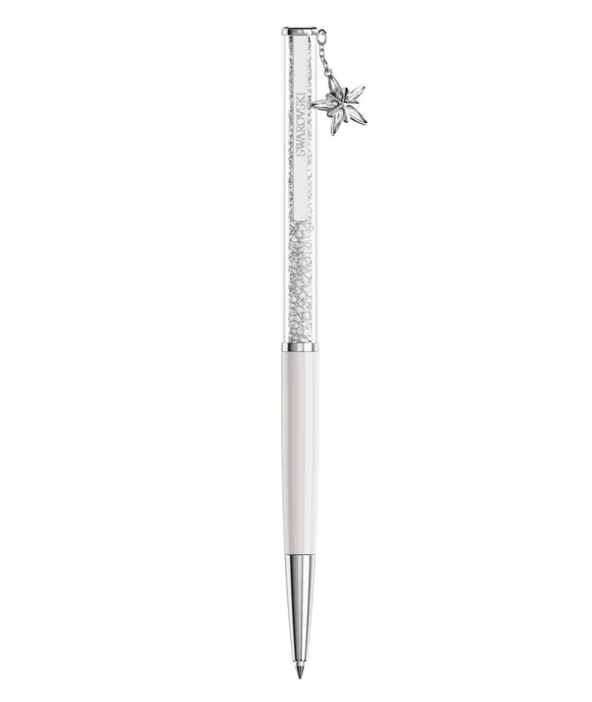 Эта шариковая ручка из ежегодной коллекции 2026 года — вневременной аксессуар для безграничного творчества. Тонкий дизайн включает около 400 прозрачных кристаллов, которые видны через длинное прозрачное окошко. Ручка, помимо лакированного белого корпуса, имеет хромированную отделку, придающую ей ультра-роскошный вид. На конце ручки расположен сияющий кулон в виде звезды, а на задней стороне выгравирован год 2026. Сменные стержни с черными и синими чернилами можно приобрести в магазинах Swarovski.