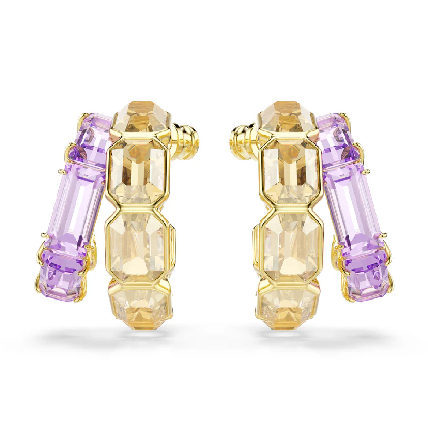 Эти разноцветные серьги – идеальный выбор для создания абсолютного гламура. Каждое изделие с покрытием оттенка цвета желтого золота состоит из двух асимметричных мини-колец с восьмиугольными карамельными кристаллами в безельной оправе и фиолетовыми кристаллами в крапановой оправе. Прекрасное сочетание контрастов, которые создают один смелый образ. Носите эти серьги с другими украшениями из той же серии, чтобы подчеркнуть эффект.