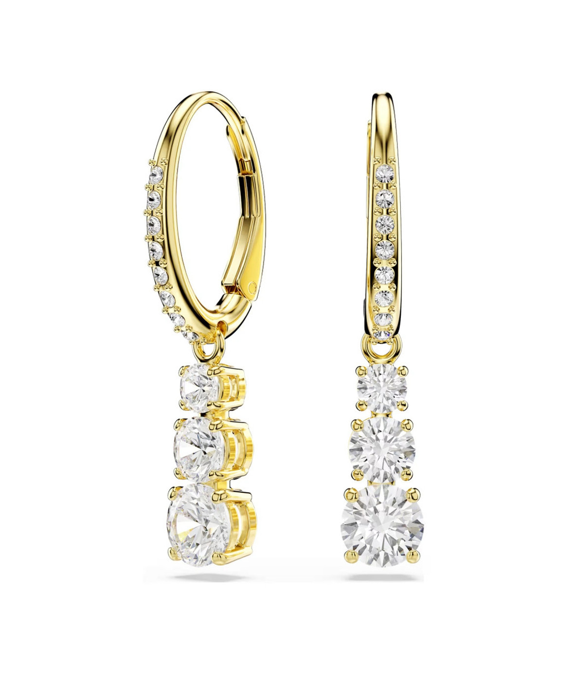 Эти потрясающие серьги созданы с учетом вечной концепции романтики. Каждое изделие украшено тремя прозрачными кристаллами Swarovski в оправе с покрытием оттенка цвета желтого золота, а кольца декорированы сверкающим паве. Элегантные, вневременные, они станут ценным памятным подарком. Для максимального эффекта сочетайте их с подходящим колье или кольцом.
