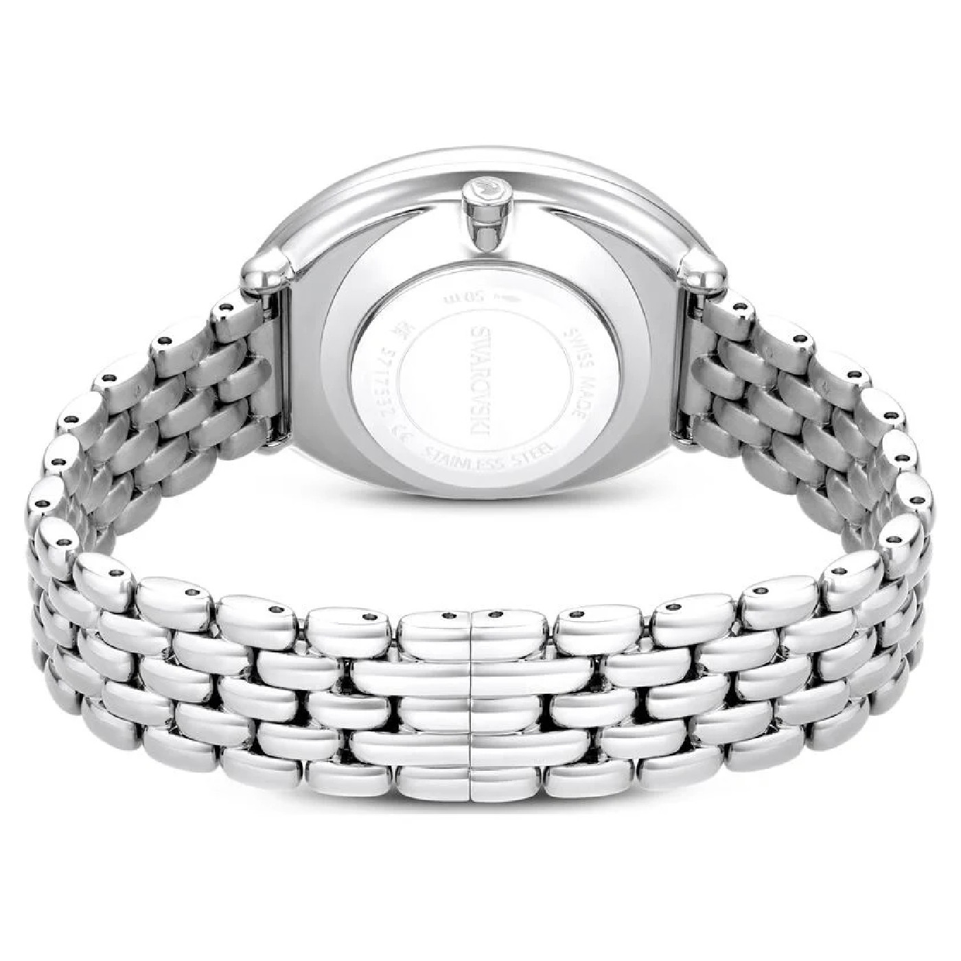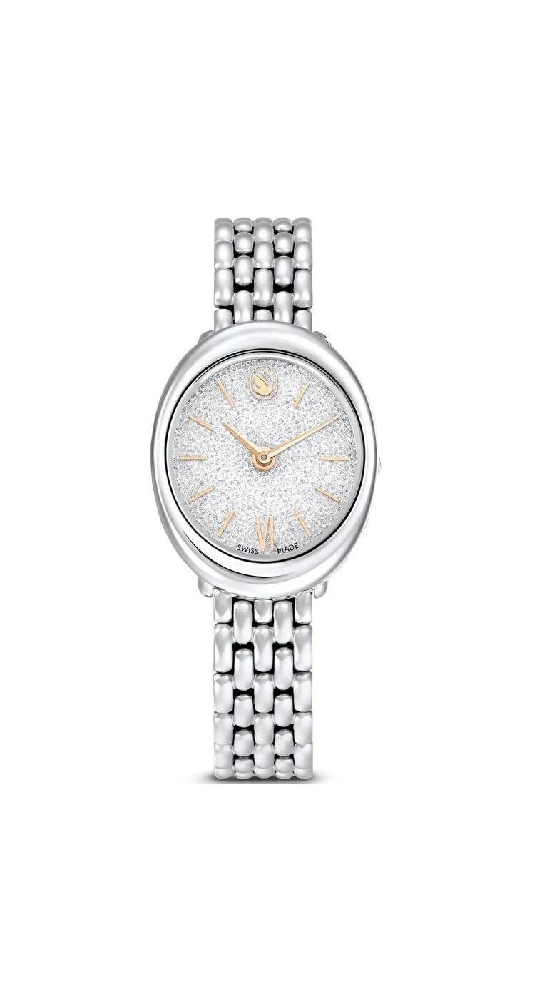 Овальные часы Imber воплощают современный подход к часовому делу благодаря сверкающему циферблату и неподвластной времени эллиптической форме. Модель размером 24 х 26,3 мм изготовлена из нержавеющей стали и украшена около 1000 прозрачными кристаллами на прозрачном циферблате. Дополнительные детали, включая часовые метки и стрелки, а также единственную римскую цифру в положении "6 часов" и знаменитый логотип Swarovski с изображением лебедя в положении "12 часов", выполнены в золотистых тонах. Швейцарские часы, выполненные на браслете из полированного металла, обладают водонепроницаемостью 50 метров.