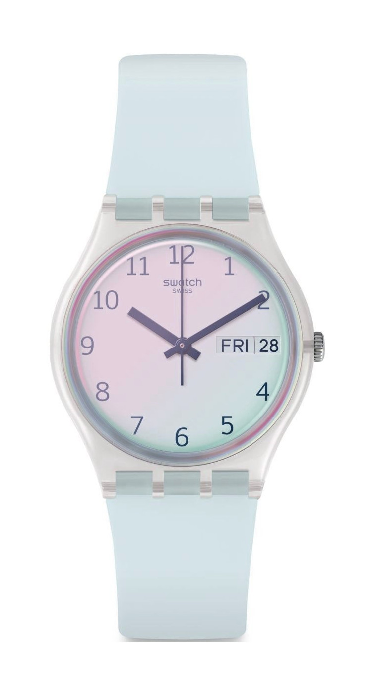 Стоит надеть модель ULTRACIEL (GE713) небесно-голубого оттенка – и тучек как не бывало. Ремешок нежно голубого цвета отлично сочетается с белоснежным циферблатом, покрытым нежно-голубым стеклом Swatch Solar Spectrum.