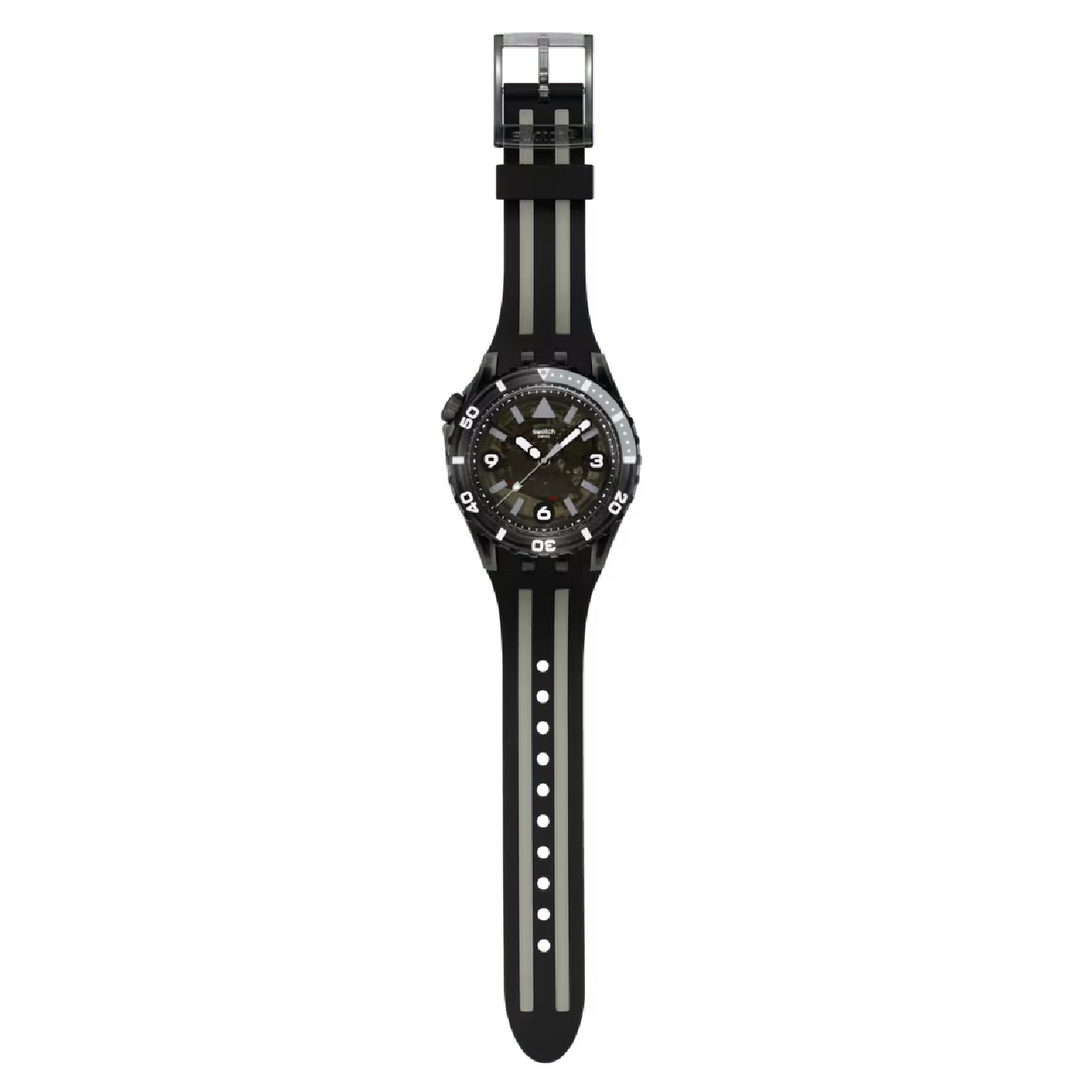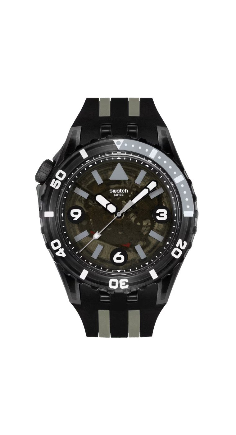 На черном просвечивающем циферблате этих дайверских часов размещены серые принтованные индексы и белые цифры. Отсчет времени под стеклом из биоматериала ведут часовая и минутная стрелки черного цвета и серая секундная. Все они светятся в темноте. Комбинированный черный корпус из биокерамики состоит из матовых и блестящих прозрачных частей. На нем расположены безель из черного просвечивающего биоматериала с серо-белым принтом, светящимся в темноте, и черная матовая заводная головка из биокерамики, размещенная в районе отметки 10 часов. Матово-прозрачный черный ремешок дополнен тренчиком в тон и просвечивающей блестящей пряжкой из биоматериала.