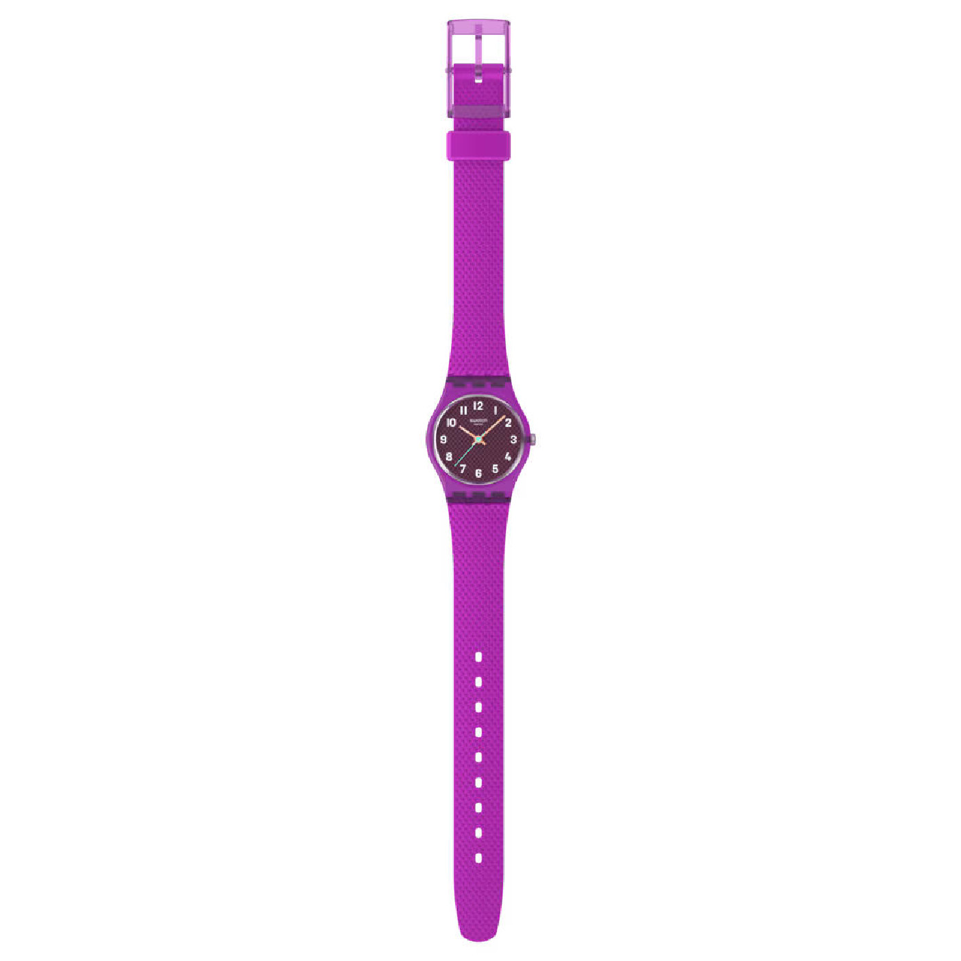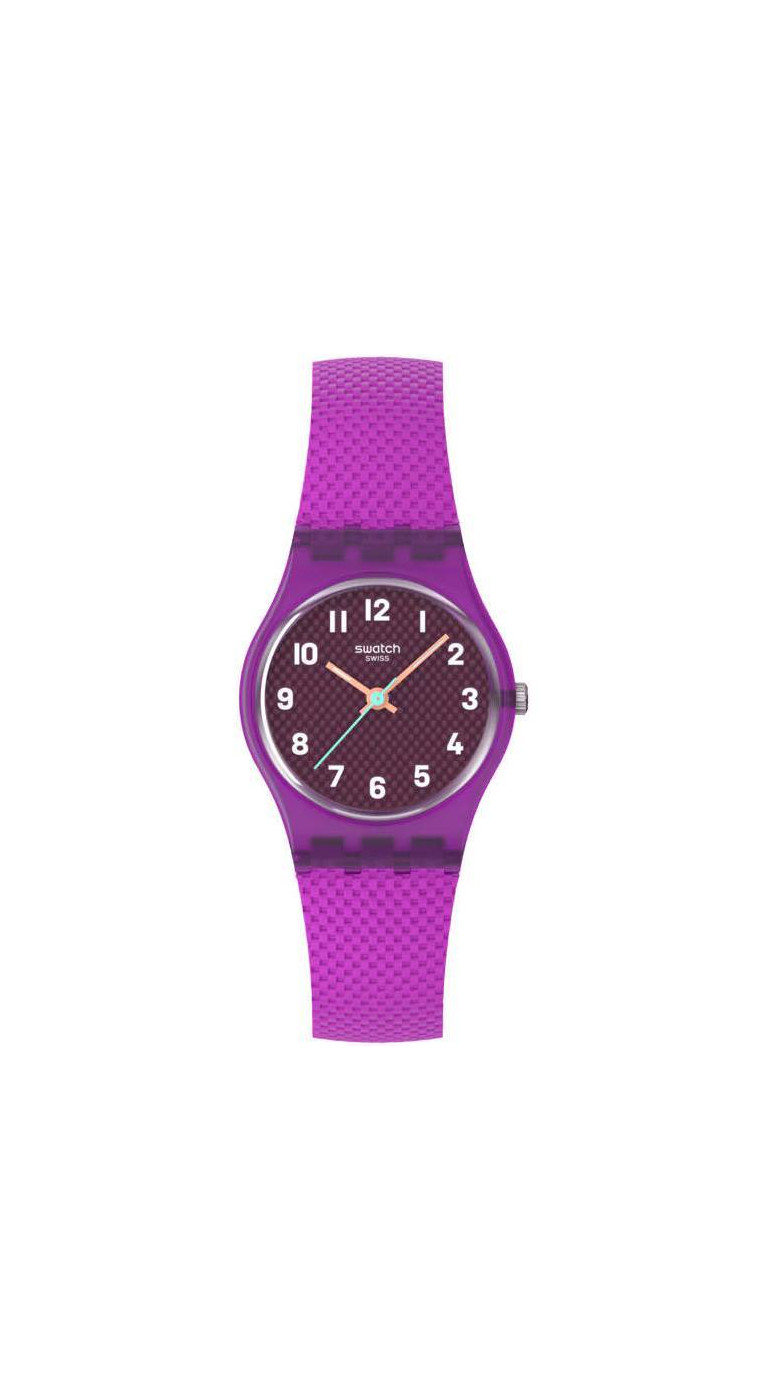 Эти часы имеют фактурный коричневый циферблат в матово-прозрачном фиолетовом корпусе с белыми печатными цифрами, часовую и минутную стрелку светло-оранжевого цвета с эффектом свечения в темноте, а также светло-зеленую секундную стрелку. Фактурный матовый фиолетовый ремешок дополнен матовым фиолетовым тренчиком и матово-прозрачной пряжкой в тон.