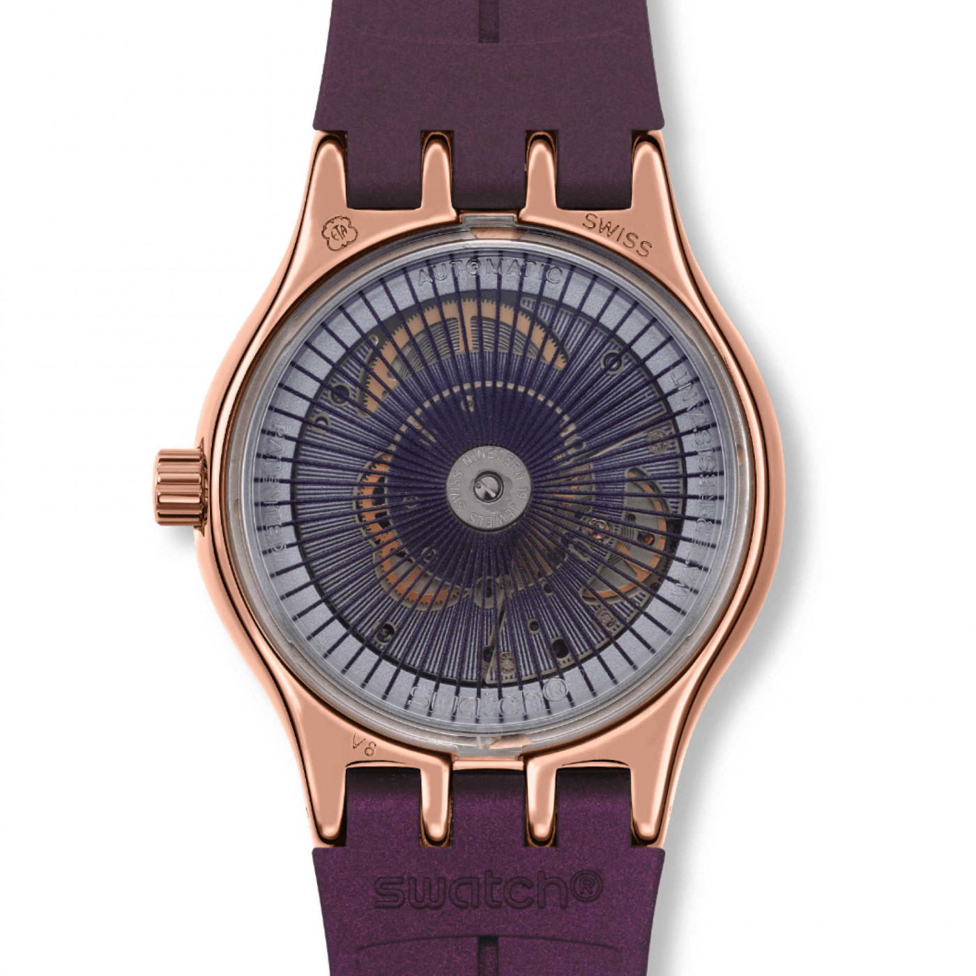 Эти автоматические часы имеют бордовый циферблат с радиальной полировкой, на котором выделяются блестящие индексы, цифры и минутная шкала сиреневого цвета, а в районе отметки 3 часа размещено окошко календаря. Отсчет времени ведут часовая и минутная стрелки расцветки розового золота, светящиеся в темноте, а также коричневая секундная. Блестящий корпус из нержавеющей стали с PVD-покрытием расцветки розового золота дополнен таким же безелем, а через заднюю крышку с цифровым принтом просматривается механизм SISTEM51. Фактурный бордовый ремешок с эффектом Anodamazing дополнен матовыми тренчиками в тон и матированной полупряжкой из нержавеющей стали с PVD-покрытием расцветки розового золота.