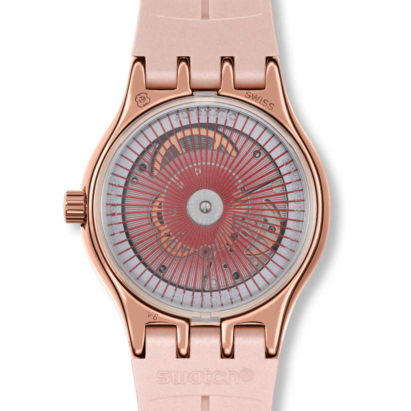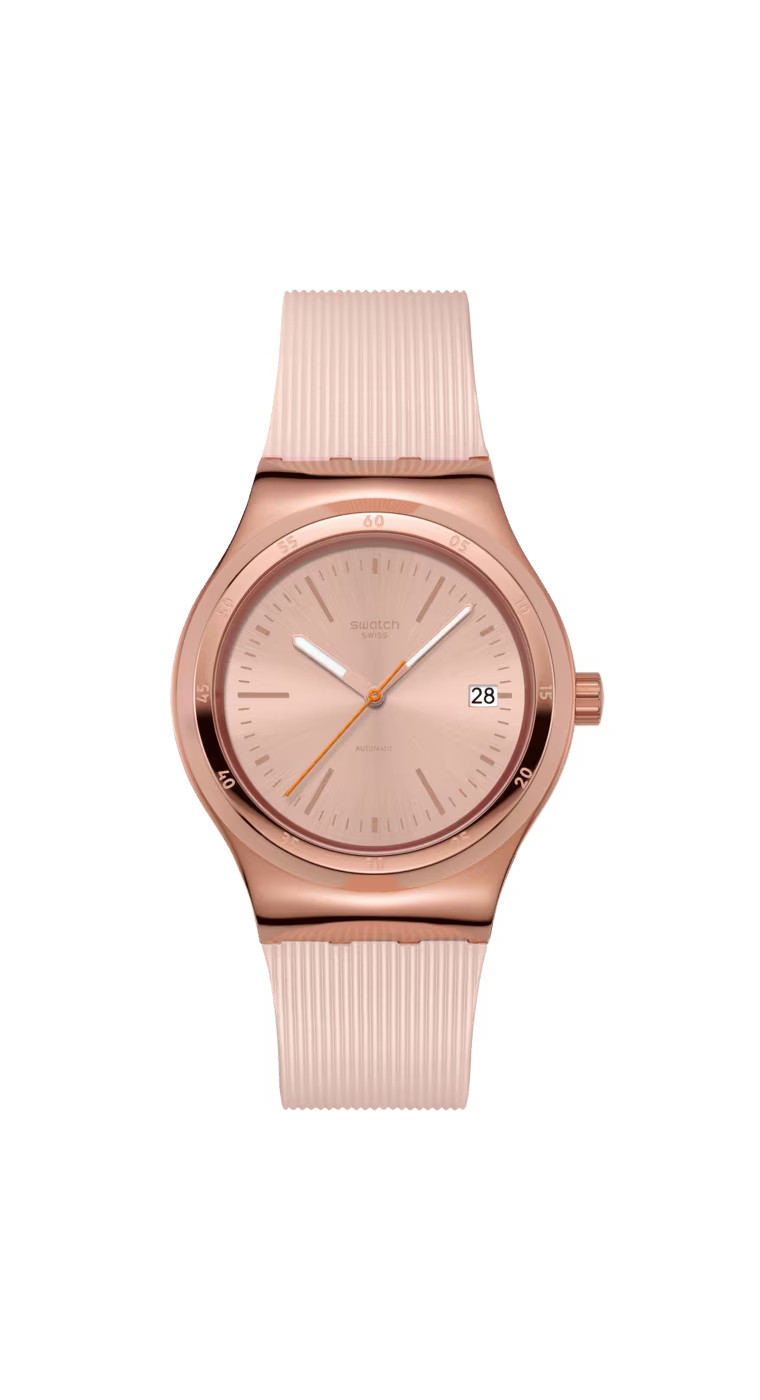 Эти автоматические часы имеют бежевый циферблат с радиальной полировкой, на котором выделяются блестящие золотистые индексы, цифры и минутная шкала, а в районе отметки 3 часа размещено окошко календаря. Отсчет времени ведут часовая и минутная стрелки расцветки розового золота, светящиеся в темноте, а также оранжевая секундная стрелка. Блестящий корпус из нержавеющей стали с PVD-покрытием расцветки розового золота дополнен таким же безелем, а через заднюю крышку с цифровым принтом просматривается механизм SISTEM51. Фактурный светло-бежевый ремешок с эффектом Anodamazing дополнен матовыми тренчиками в тон и блестящей полупряжкой из нержавеющей стали с PVD-покрытием расцветки розового золота