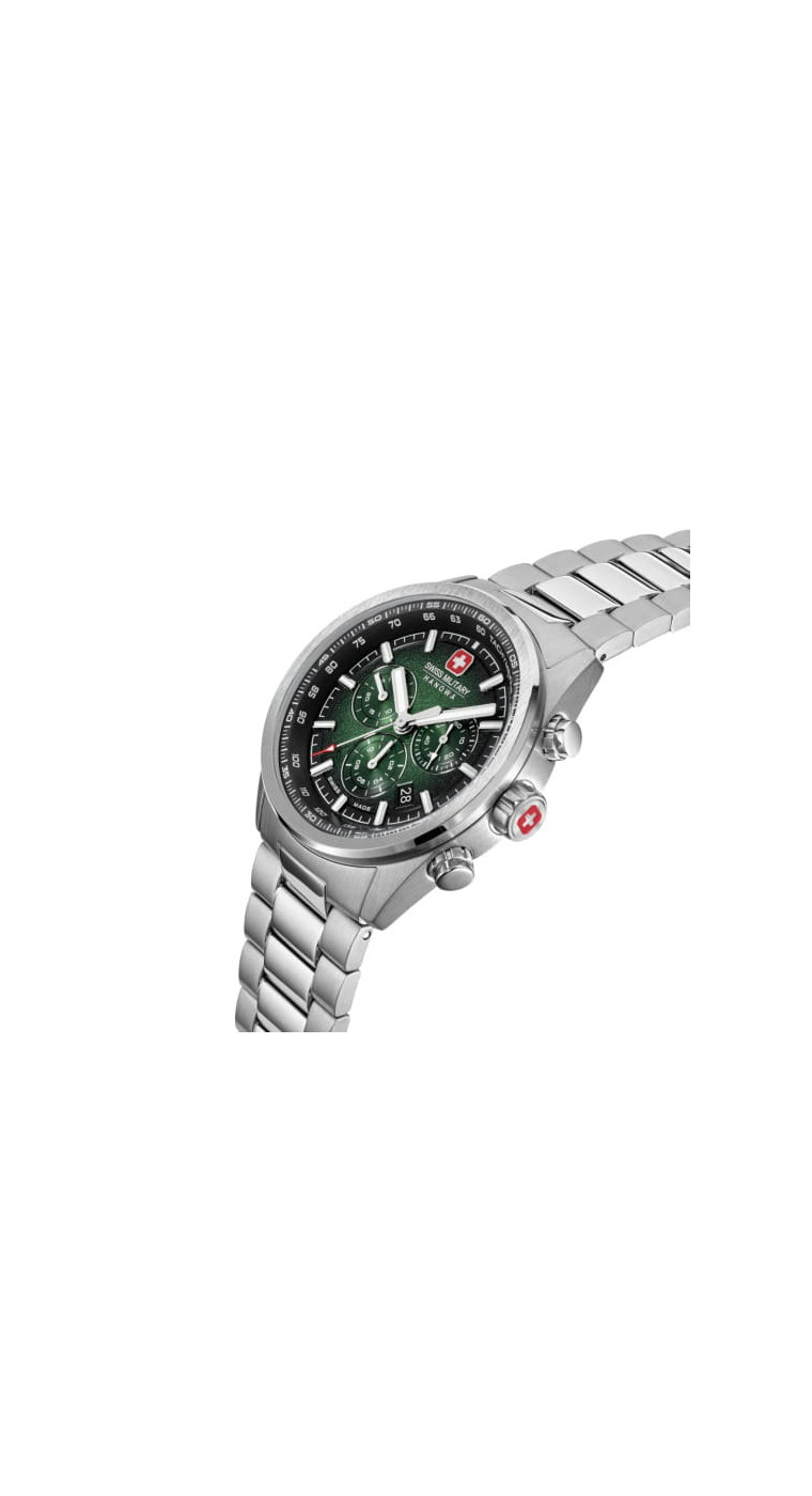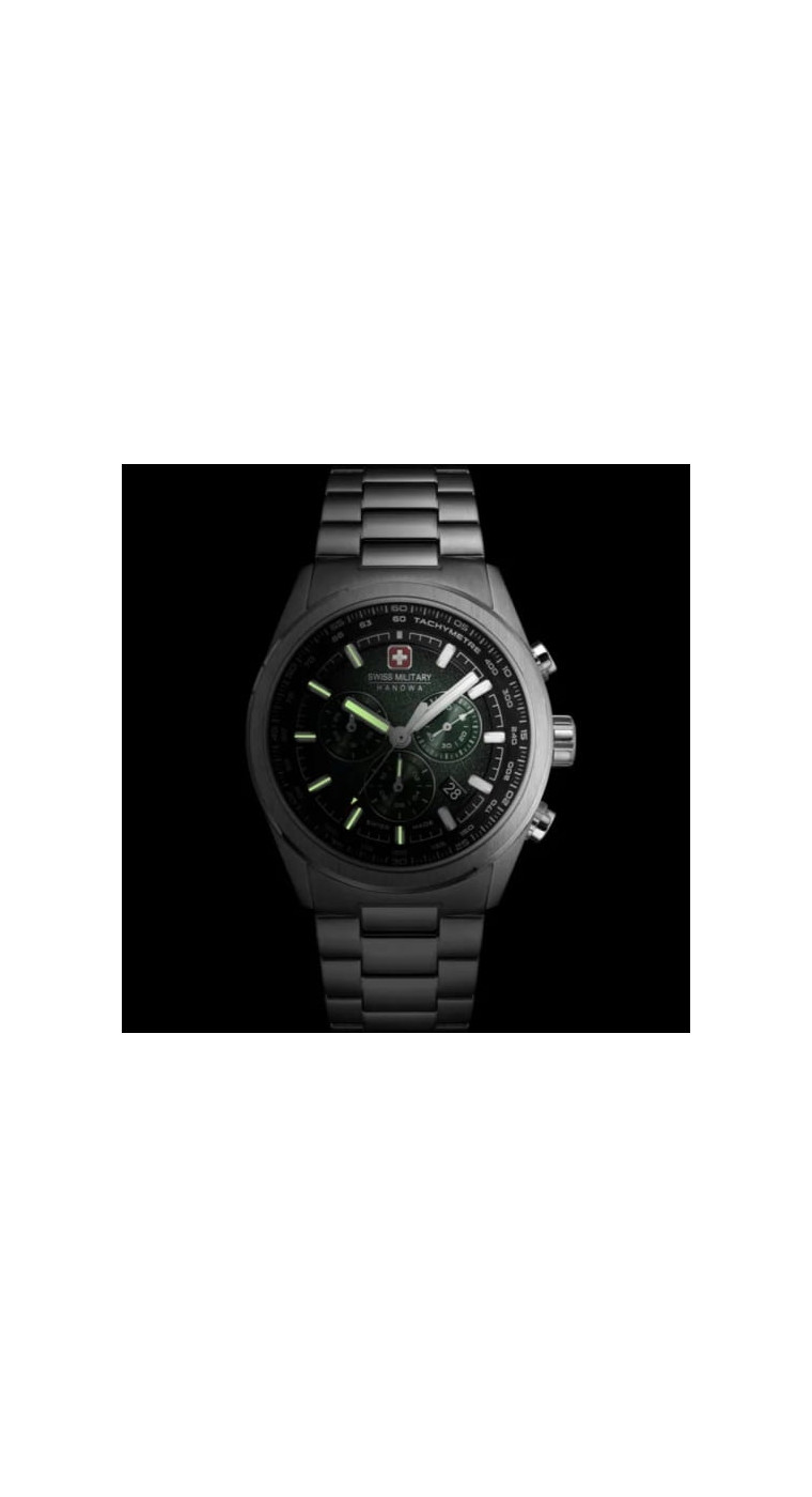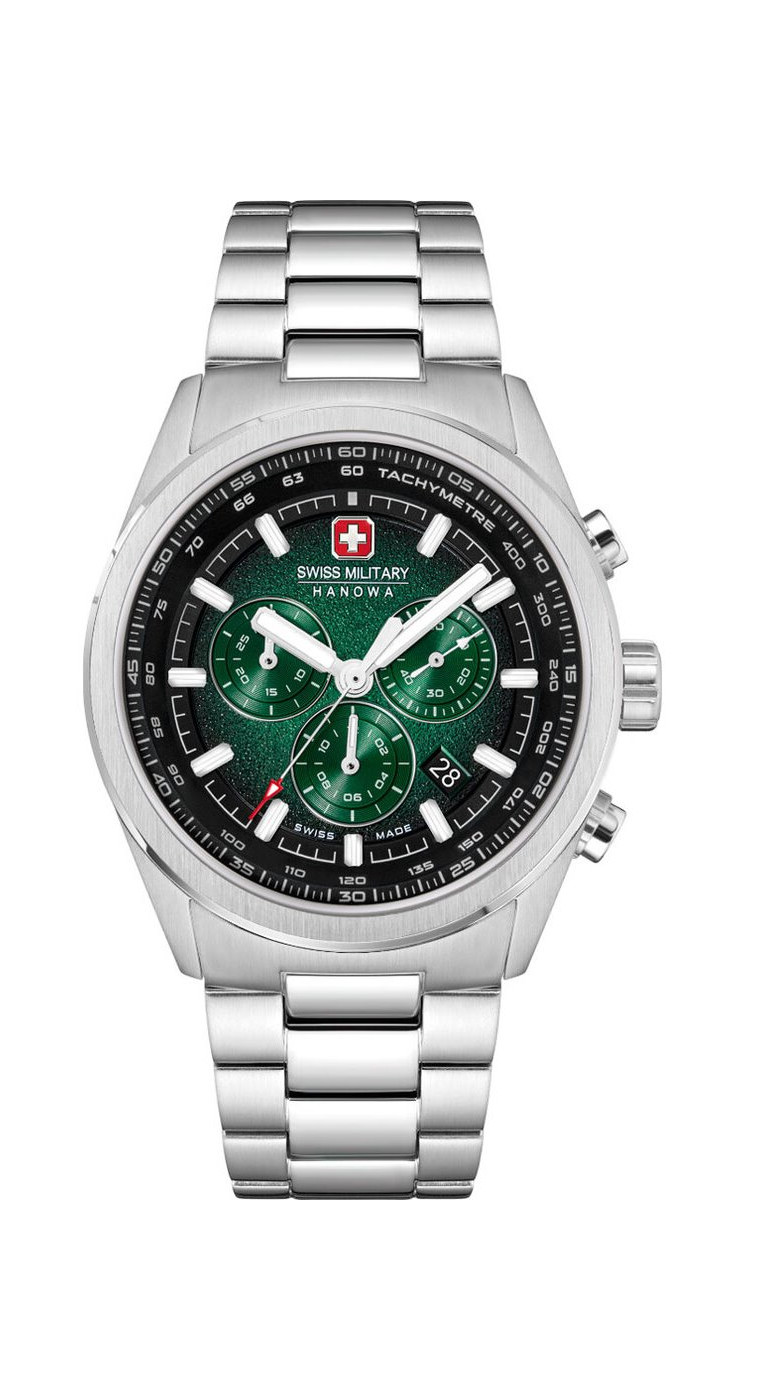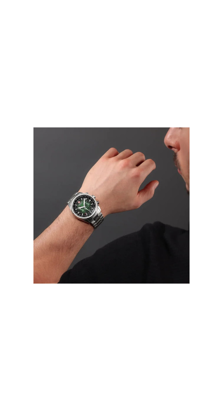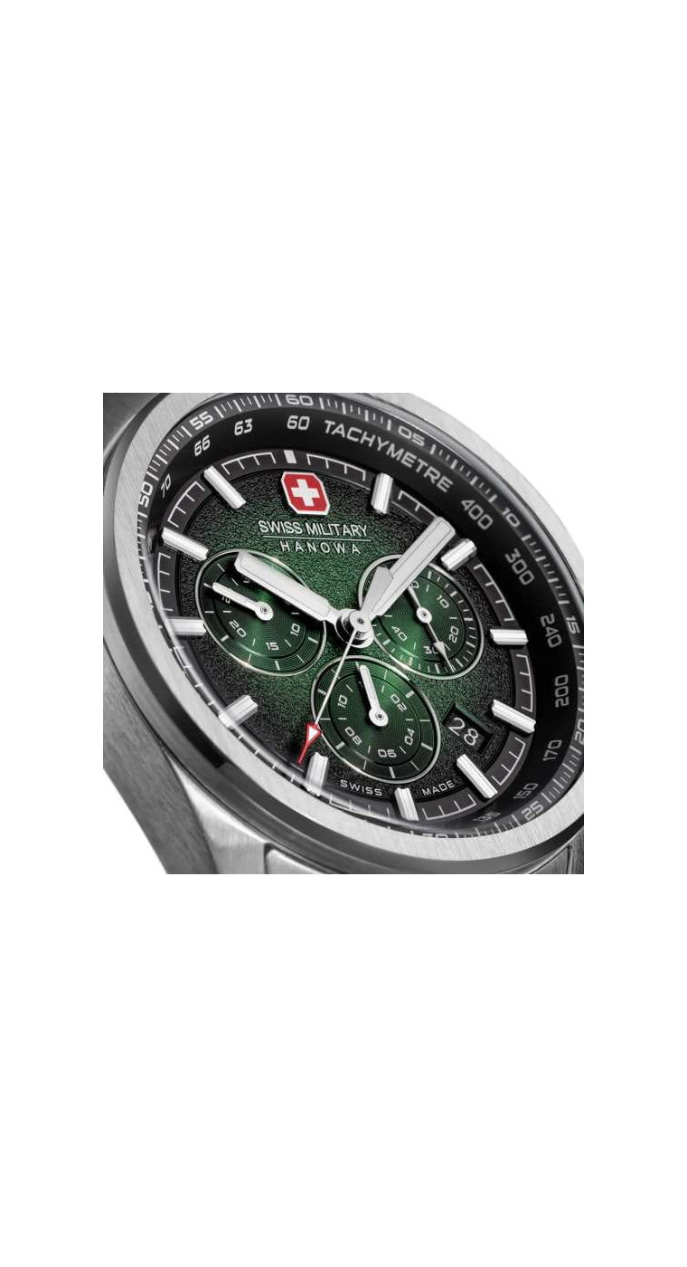 Швейцарские военные часы Hanowa SMWGI0004206 Navalus Pro Chrono сочетают в себе швейцарскую точность и яркий дизайн, сочетающий в себе спортивность и изысканность. Их темно-зеленый циферблат с динамичной отделкой «солнечные лучи» сразу привлекает внимание, выделяясь на фоне серебристых индексов и стрелок.