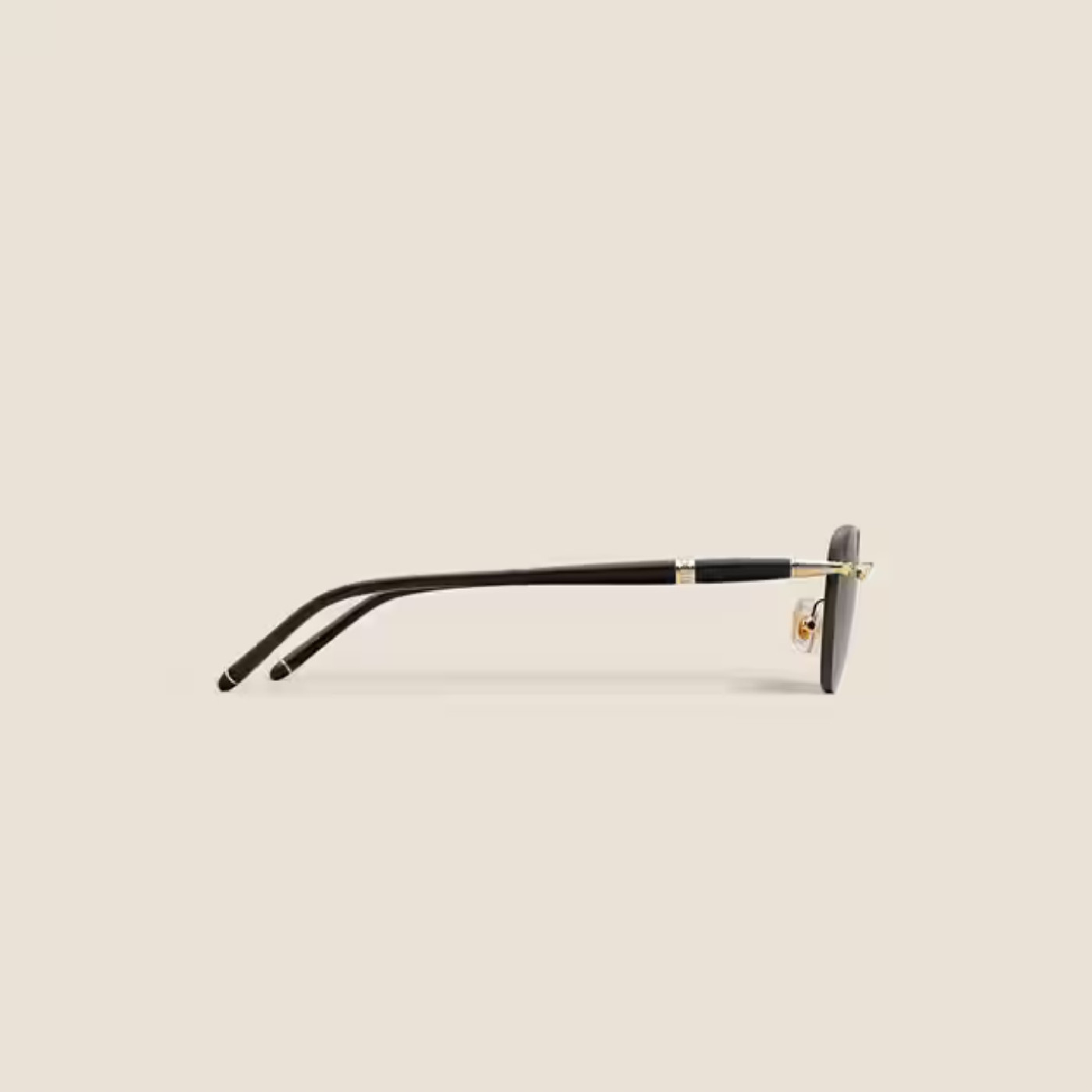 Эти солнцезащитные очки без оправы, круглой формы, имеют металлическую оправу золотистого цвета и серые линзы. Трубчатые дужки, вдохновленные письменными принадлежностями Meisterstück, украшены надписью Montblanc. Логотип Montblanc выгравирован лазером на левой линзе.