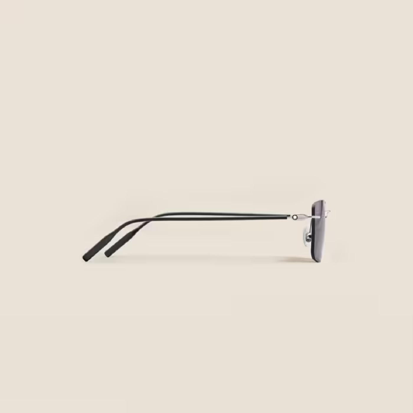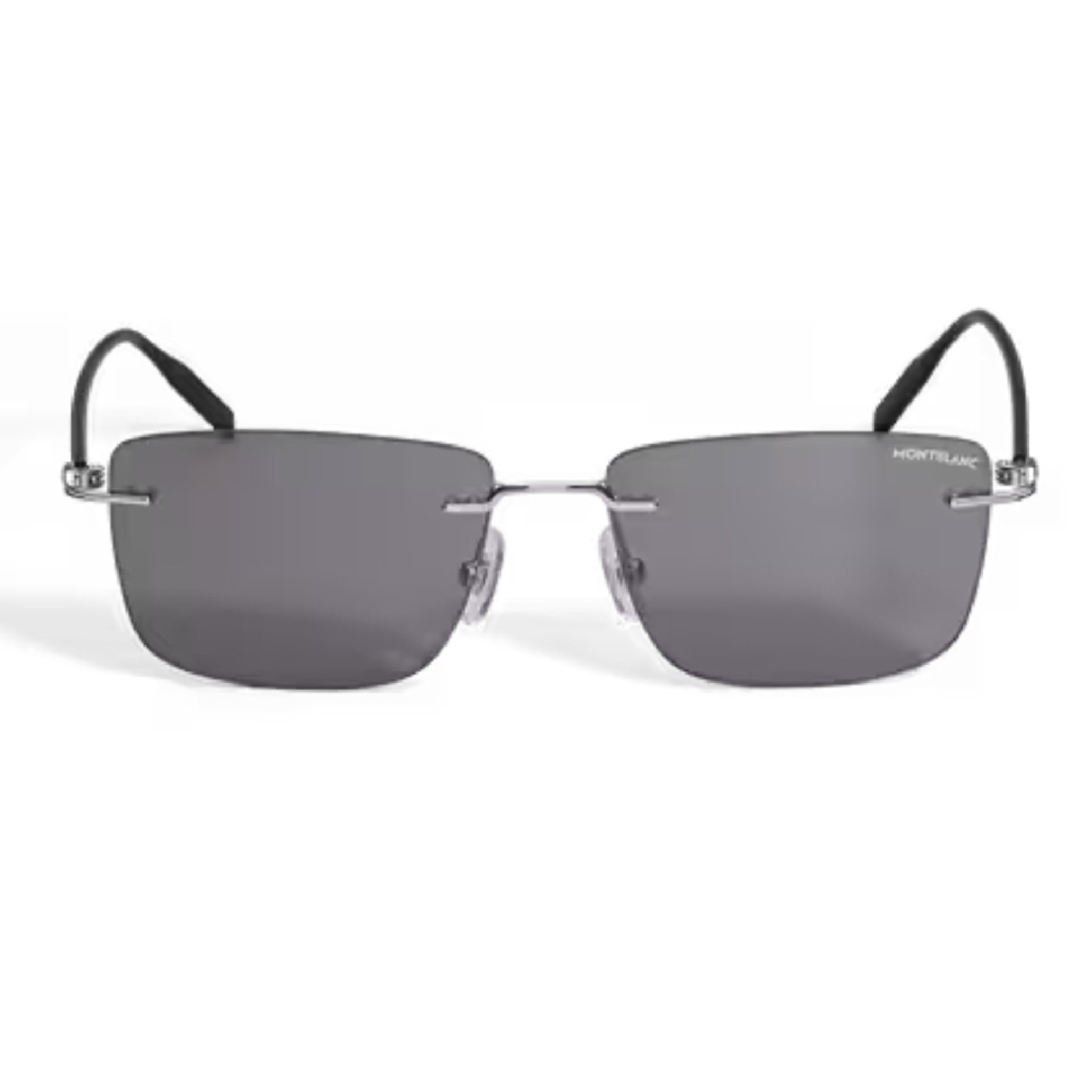 Эти солнцезащитные очки без оправы прямоугольной формы имеют металлическую раму серебристого цвета и серые линзы. Эмблема Montblanc вписана в дизайн заушников. Логотип Montblanc выгравирован лазером на левой линзе очков.