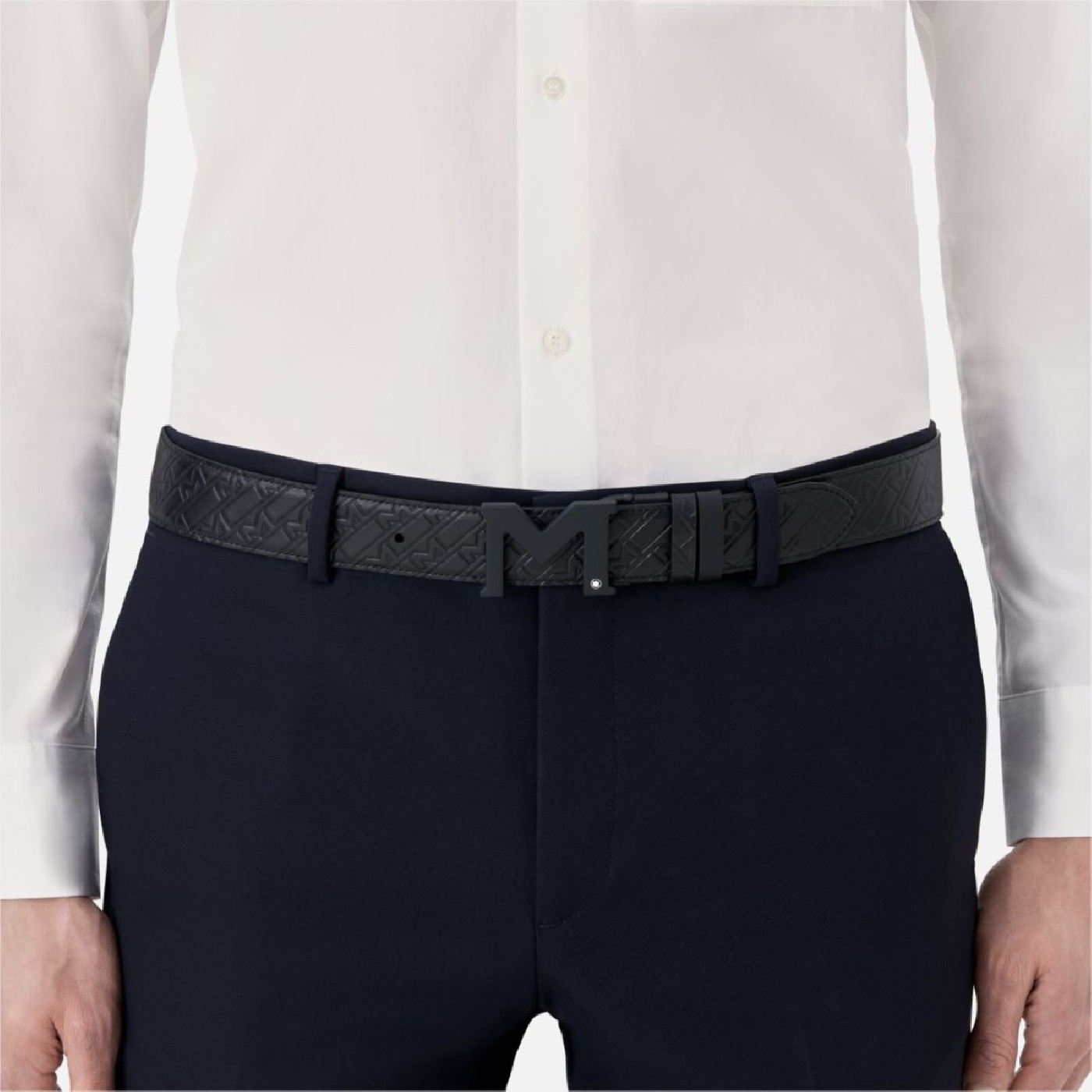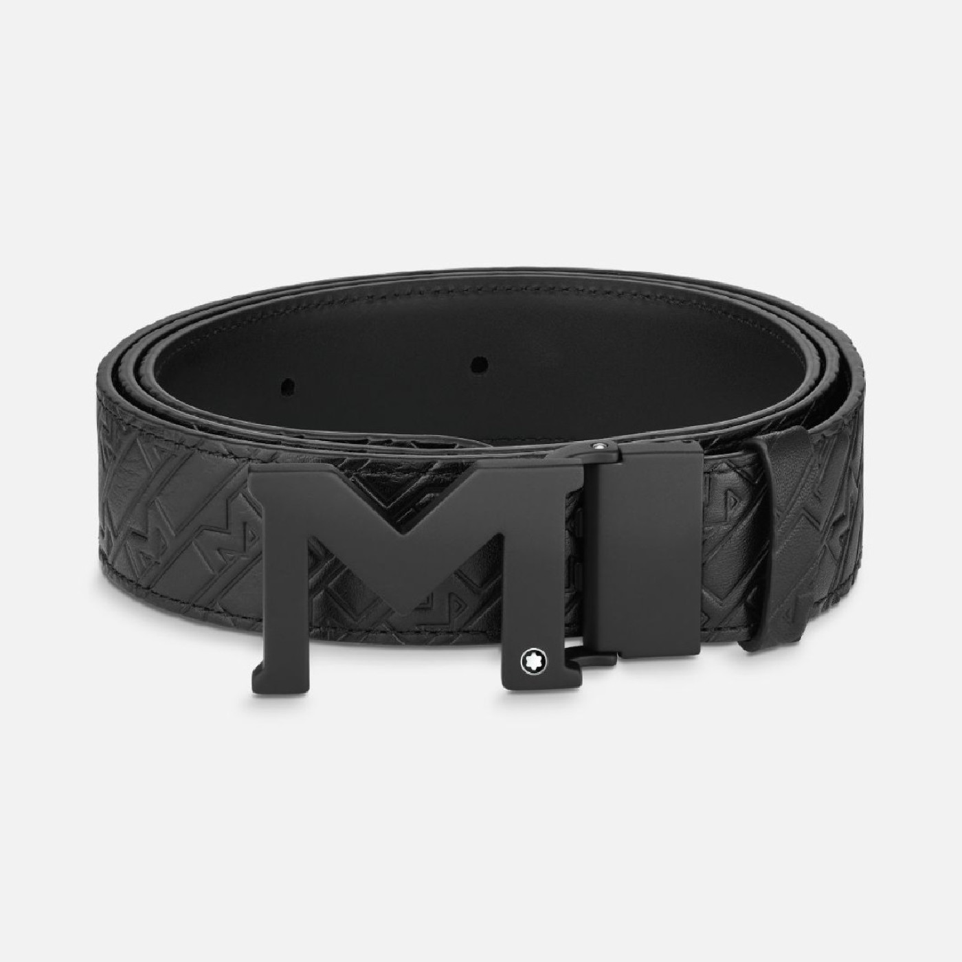 Пряжка M из нержавеющей стали с черной прорезиненной отделкой. Саморегулирующийся двусторонний ремешок размером 35 мм x 1200 мм из черной кожи с тиснением с узором M с одной стороны и однотонного черного цвета с другой. Универсальный аксессуар, созданный для смелого образа.