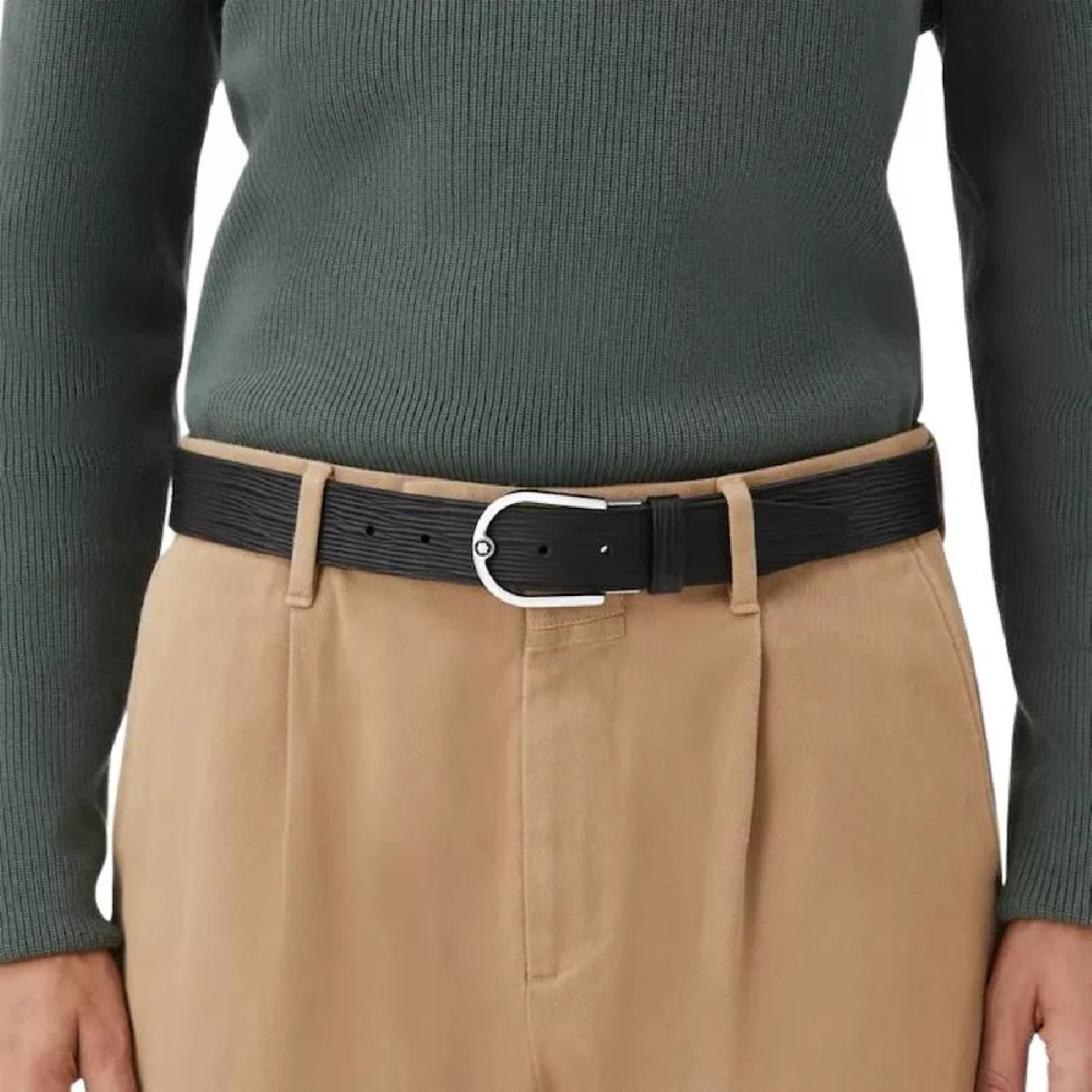 Этот двусторонний ремень с рисунком коры дерева с одной стороны и гладкой черной кожей с другой стороны, дополнен пряжкой в виде подковы с палладиевой отделкой и эмблемой Montblanc.