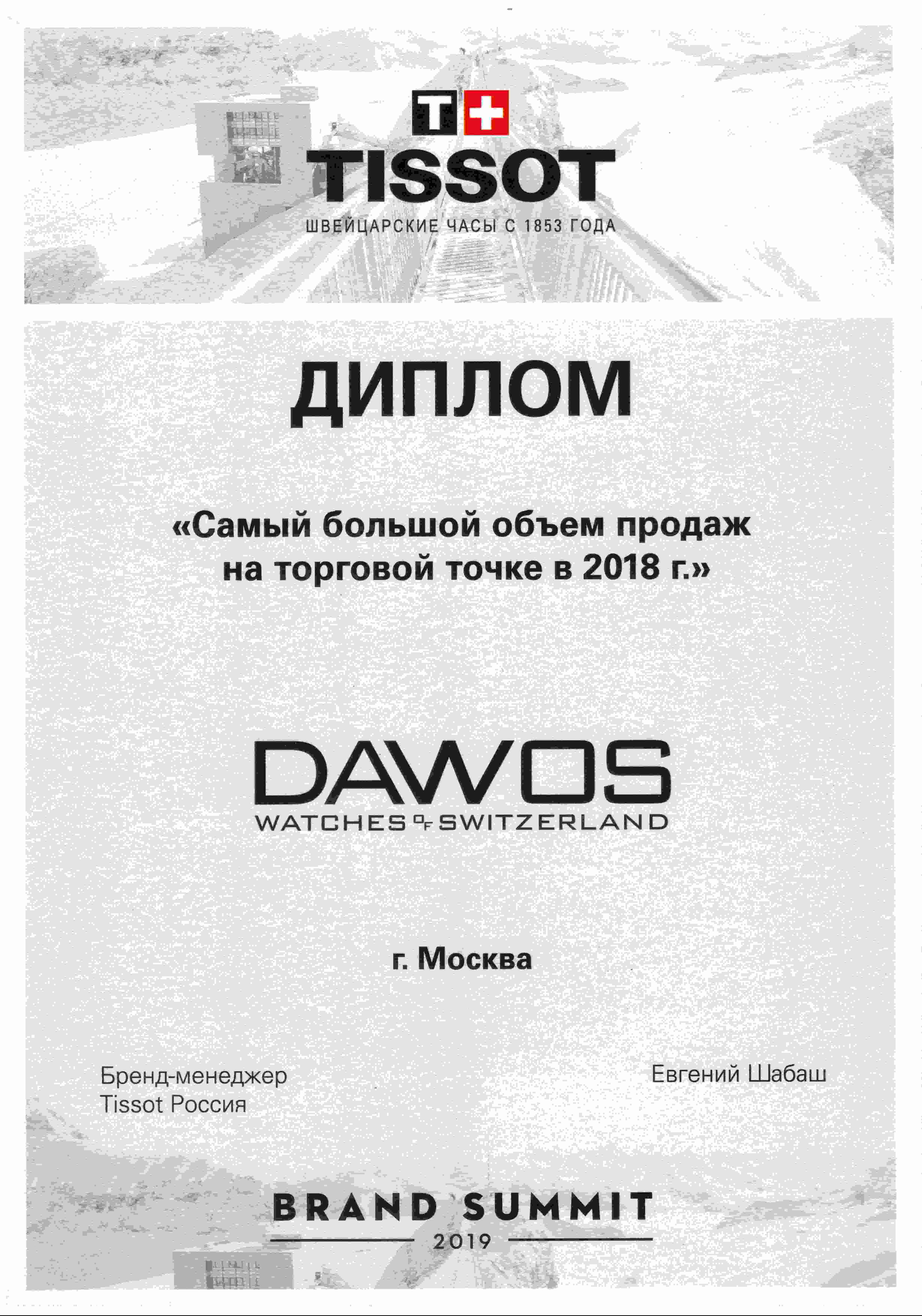 В 2018 году мы получаем диплом за самый большой обьем продаж Tissot.